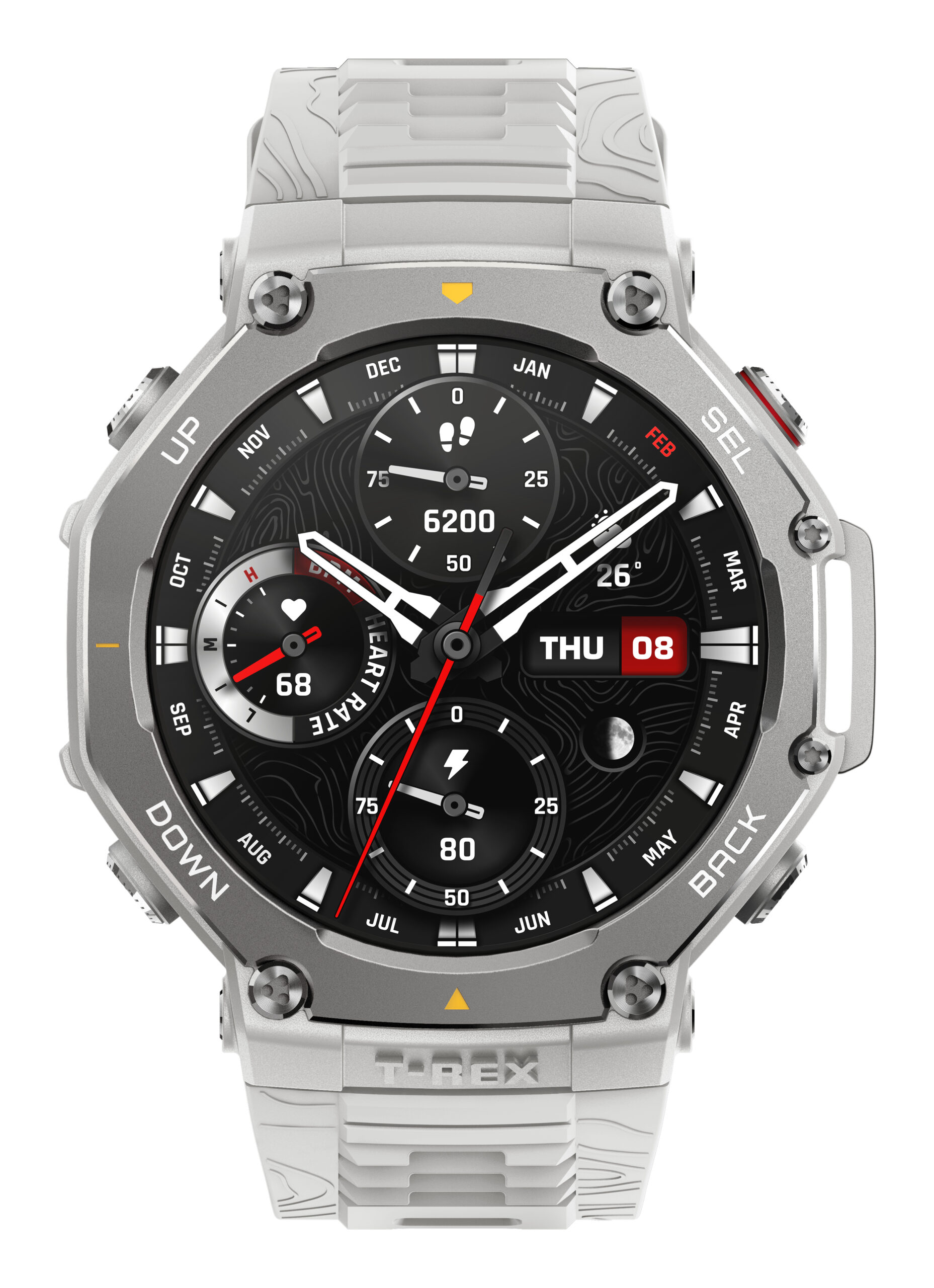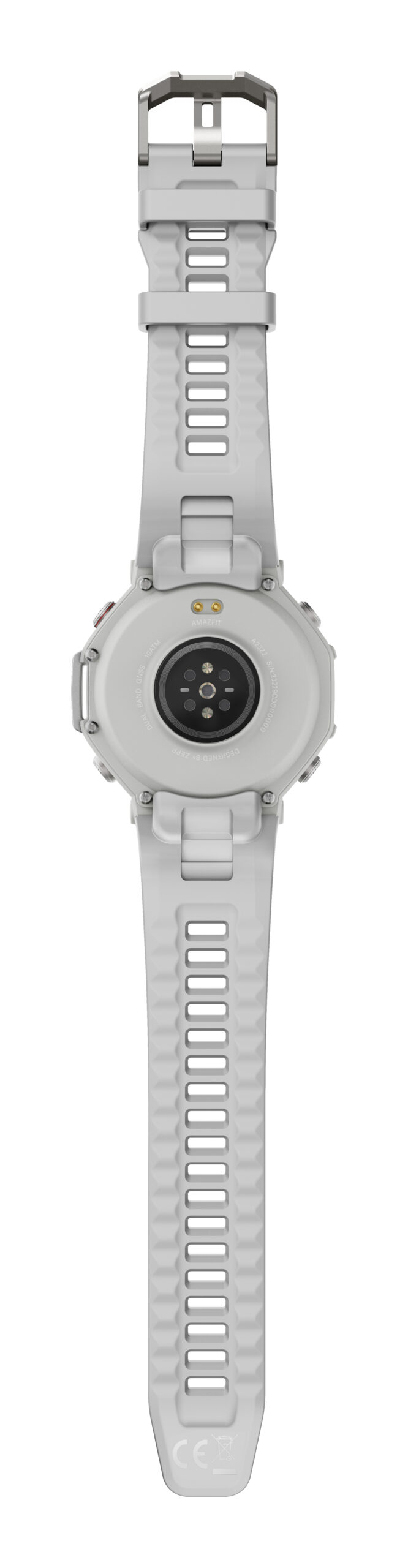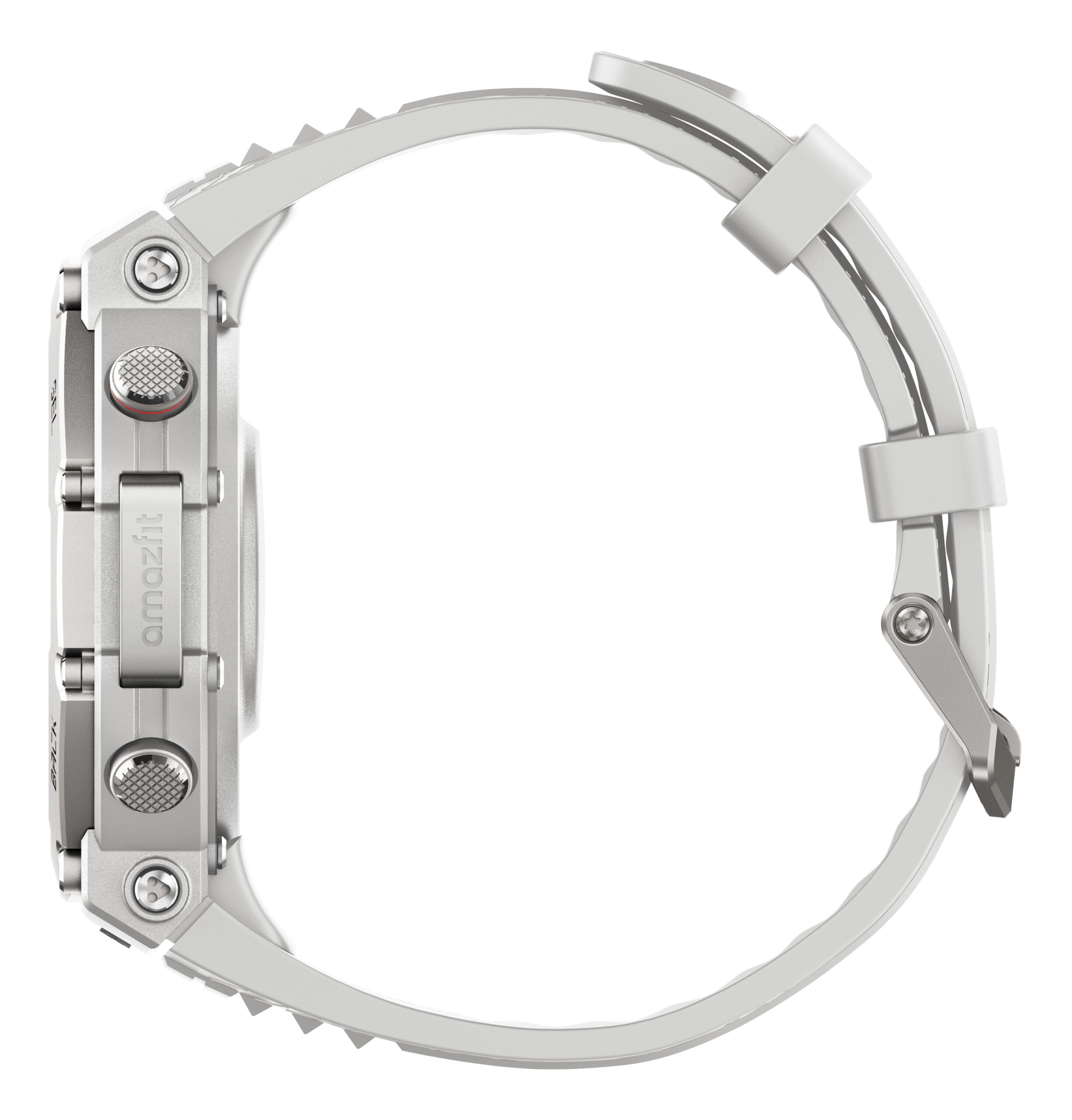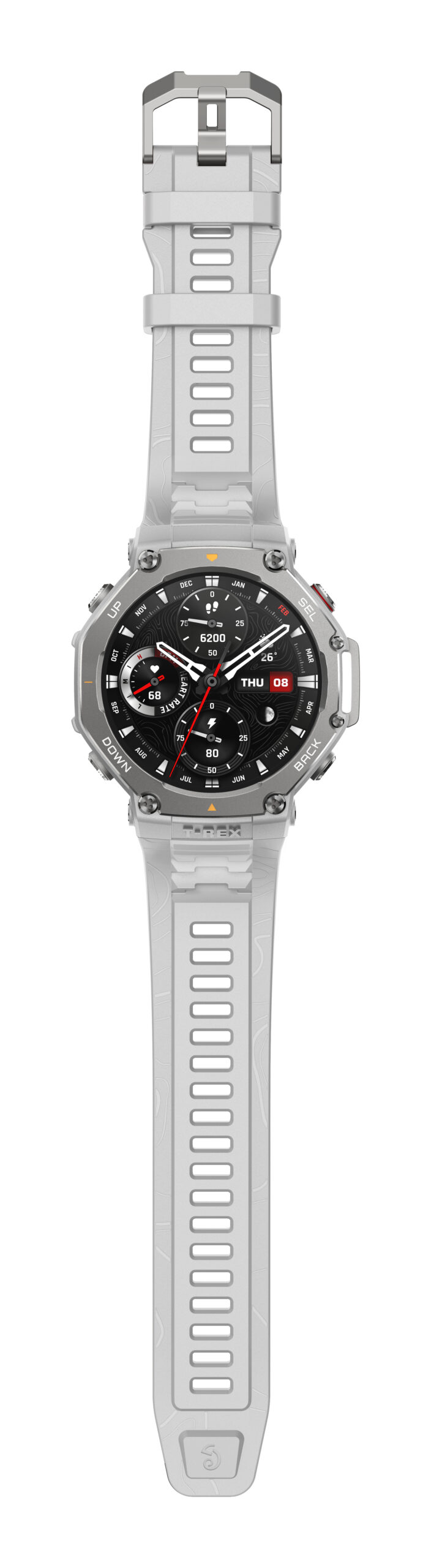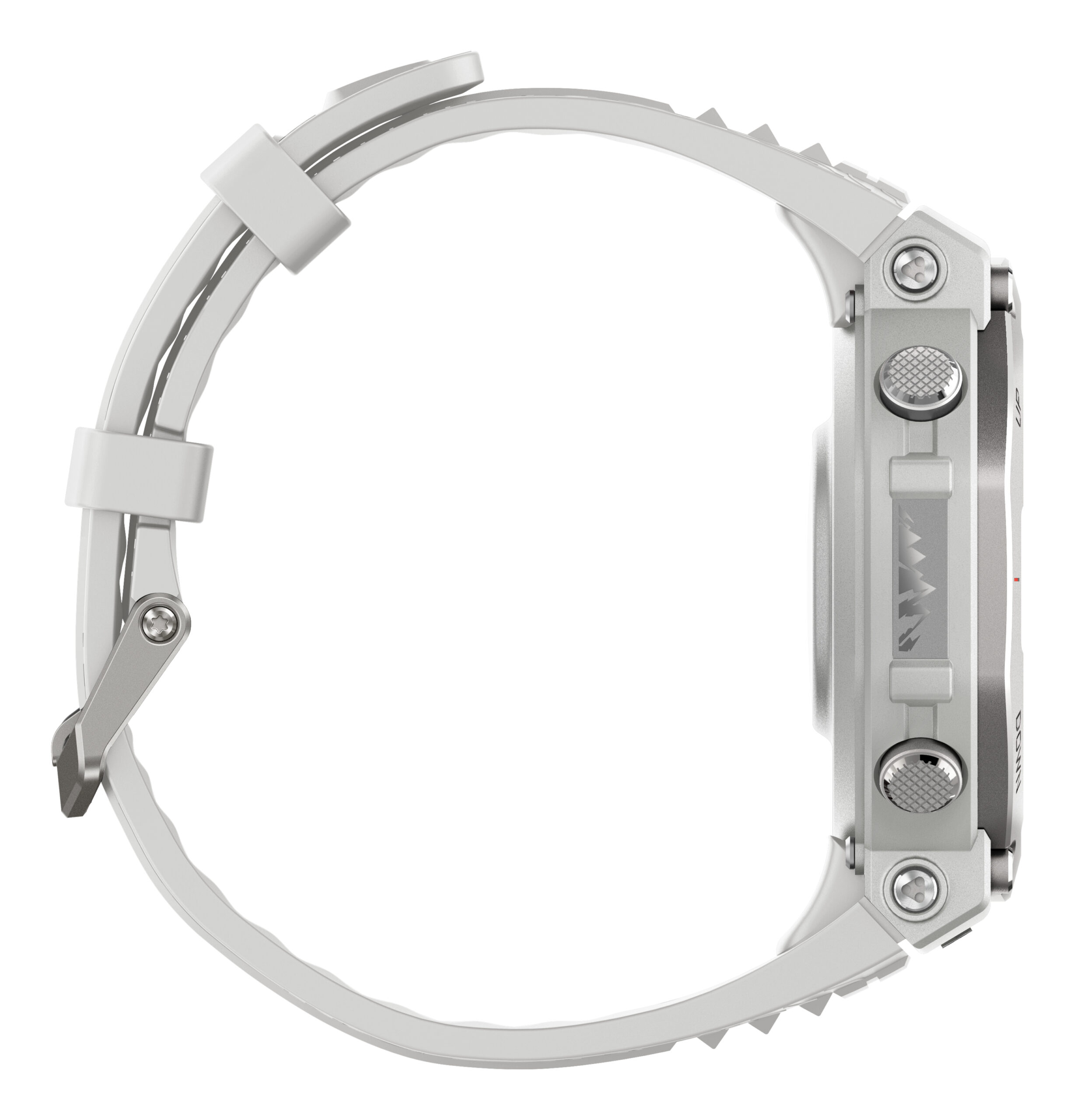 Amazfit T-Rex 3. Beeldschermdiagonaal: 3,81 cm (1.5″), Display technologie: AMOLED, Resolutie: 480 x 480 Pixels, Touchscreen. RAM-capaciteit: 64 MB, Flash memory: 32 GB. GPS. Capaciteit van de accu/batterij: 700 mAh. Gewicht: 68,3 g. Waterdicht tot: 100 m, Band materiaal: Silicone, Band kleur: Grijs. Inclusief besturingssysteem: Zepp OS