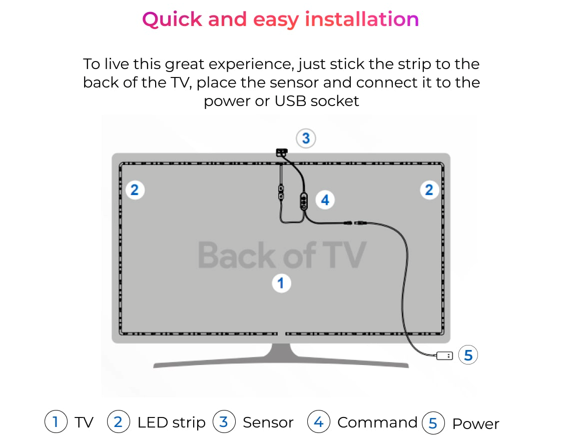 De AmbiGlow LED-strip is voorzien van RGB-technologie, waardoor hij een enorm aantal kleuren kan weergeven. Welke kleuren er ook op uw scherm verschijnen, de AmbiGlow emuleert ze perfect. Bovendien beschikken de strips met een lichtstroom van 518 lumen over een uitzonderlijk lichtvermogen.
