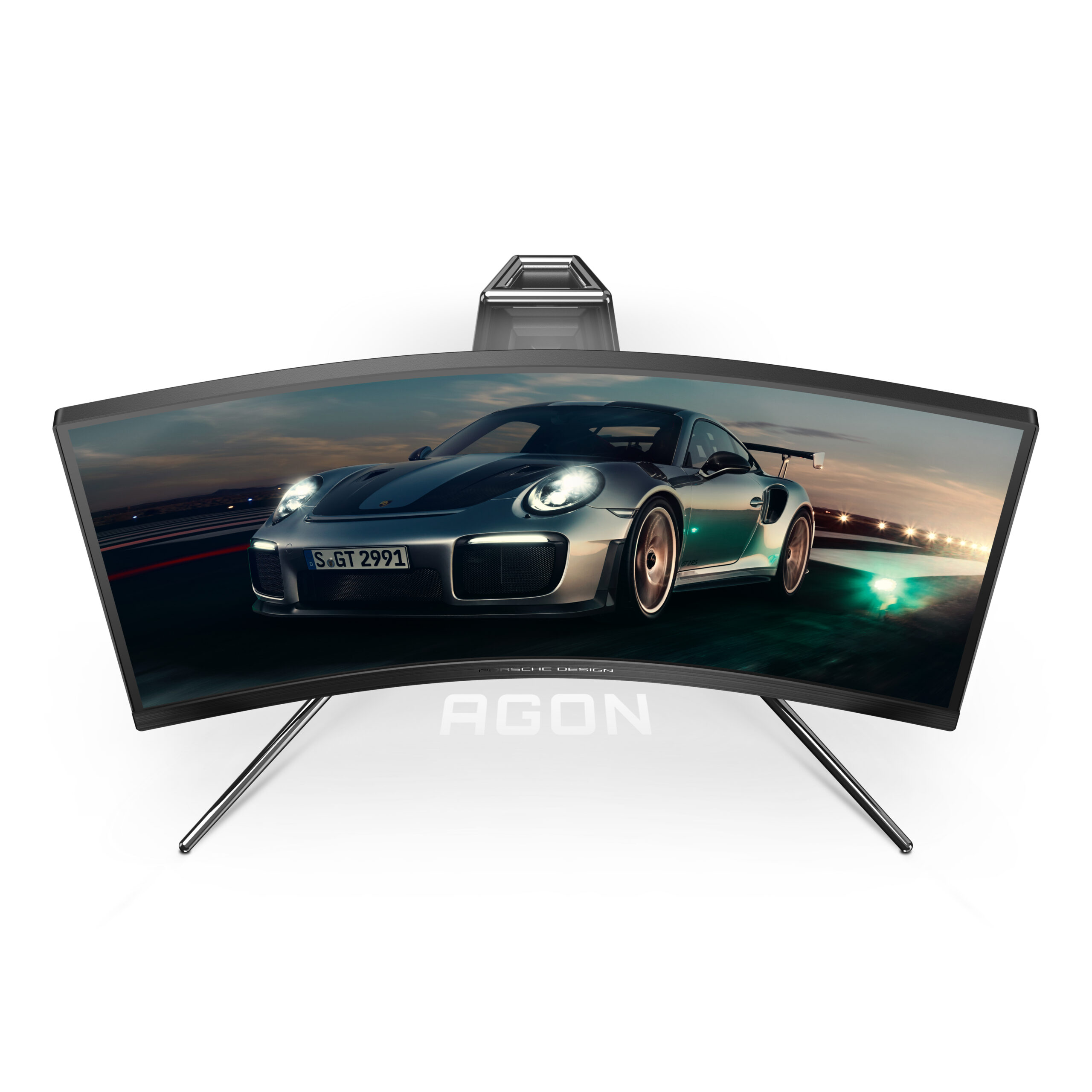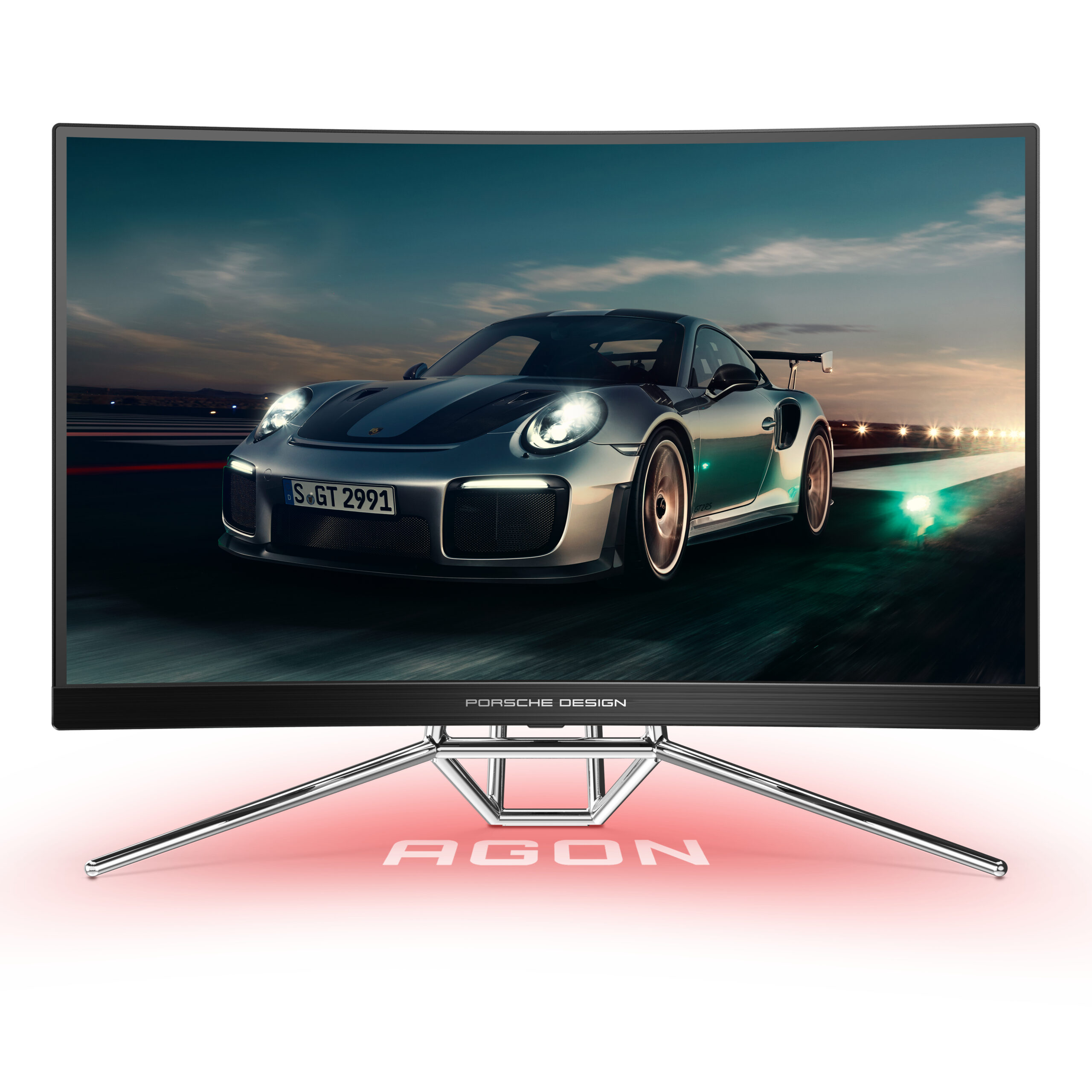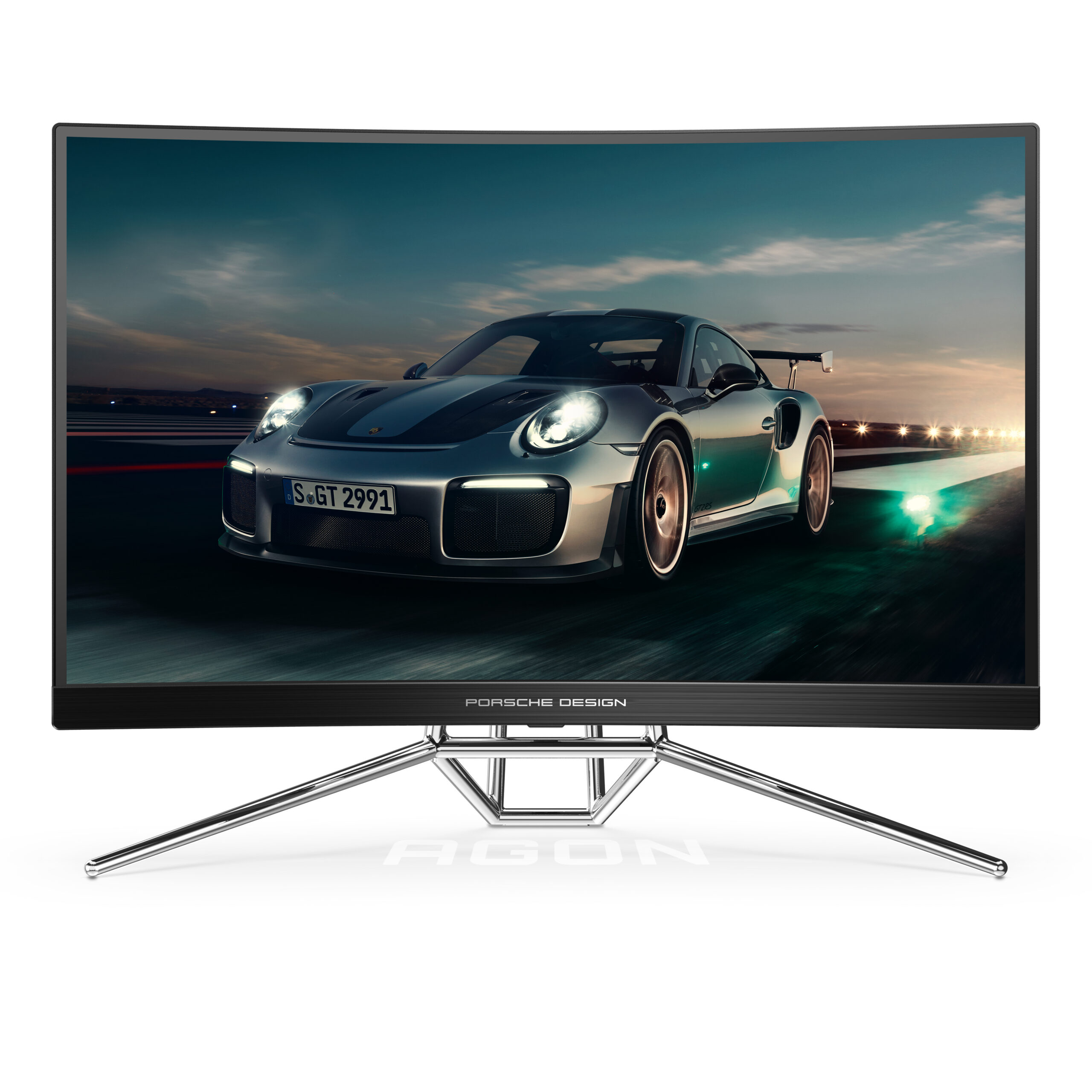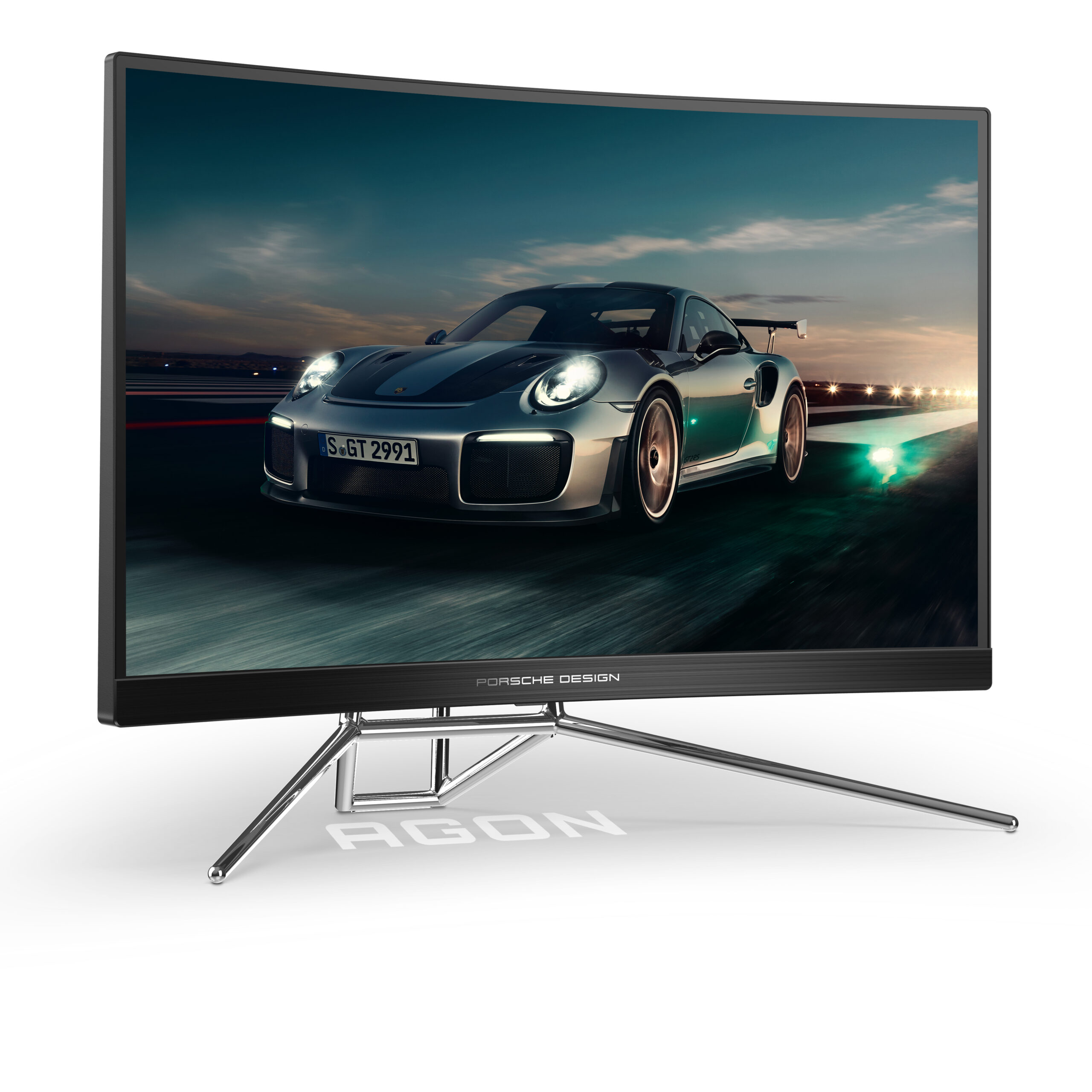 Porsche Design AOC AGON gaming monitor. De 27” biedt als 1000R-gebogen paneel een resolutie van QHD met 240Hz voor de perfecte gaming-ervaring – onafhankelijk van je snelheid.