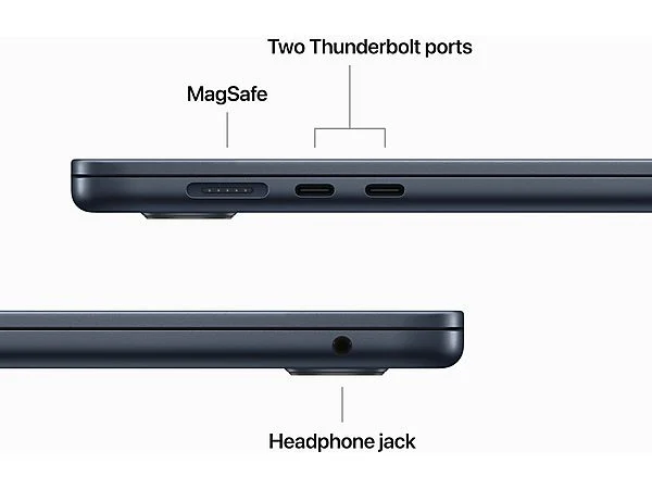 De MagSafe-oplaadkabel bevat magneten waardoor je hem makkelijk vastmaakt en weer losmaakt. Je hoeft dus niet bang te zijn dat je MacBook Air opeens door de lucht vliegt. Via de twee Thunderbolt-poorten kun je professionele accessoires aansluiten en je Mac opladen. Je kunt ook een display aansluiten met een resolutie tot 6K. En de mini‑jack-aansluiting ondersteunt koptelefoons met hoge impedantie.