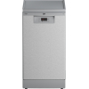 Beko BDFS15020X. Apparaatplaatsing: Vrijstaand, Productafmeting: Slimline (45 cm), Deurkleur: Zilver. Aantal couverts: 10 couverts, Geluidsemissieklasse: C, Geluidsniveau: 47 dB. Energie-efficiëntieklasse: E, Waterconsumptie per cyclus: 9,5 l, Energieverbruik per 100 cycli: 76 kWu. Breedte: 448 mm, Diepte: 600 mm, Hoogte: 850 mm. Breedte verpakking: 494 mm, Diepte verpakking: 661 mm, Hoogte verpakking: 889 mm
