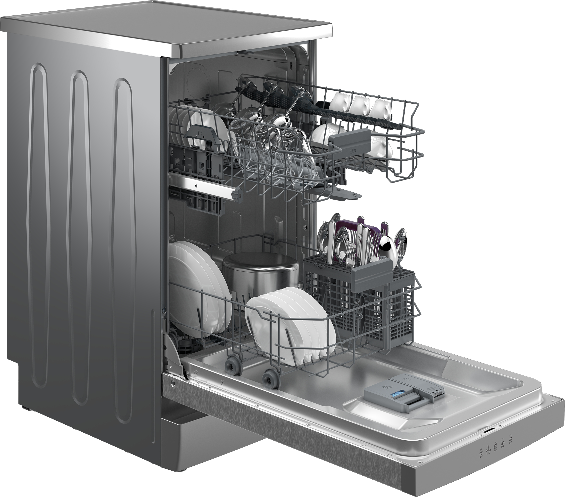 Beko BDFS15020X. Apparaatplaatsing: Vrijstaand, Productafmeting: Slimline (45 cm), Deurkleur: Zilver. Aantal couverts: 10 couverts, Geluidsemissieklasse: C, Geluidsniveau: 47 dB. Energie-efficiëntieklasse: E, Waterconsumptie per cyclus: 9,5 l, Energieverbruik per 100 cycli: 76 kWu. Breedte: 448 mm, Diepte: 600 mm, Hoogte: 850 mm. Breedte verpakking: 494 mm, Diepte verpakking: 661 mm, Hoogte verpakking: 889 mm