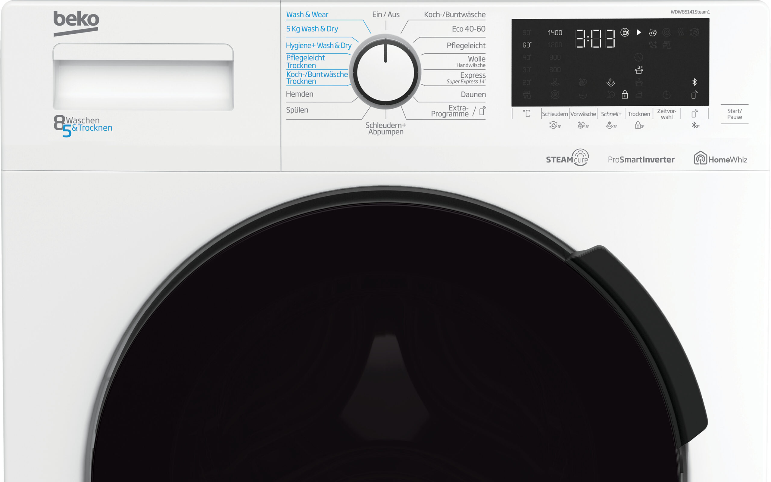 Beko WDW85141Steam1, Voorbelading, Vrijstaand, Wit, Links, Zwart, Roestvrijstaal