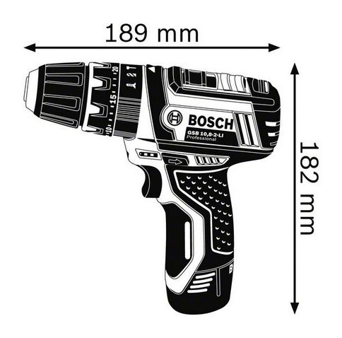 Bosch GSB 10,8-2-LI Professional. Productontwerp: Boormachine met pistoolgreep, Boorhouder: Zonder sleutel. Spanklauw breedte (max): 1 cm, Boor diameter in hout (max): 1,9 cm, Boor diameter in staal (max): 1 cm. Stroombron: Batterij/Accu, Accu/Batterij voltage: 10,8 V. Vibratie emissie: 10,5 m/s²