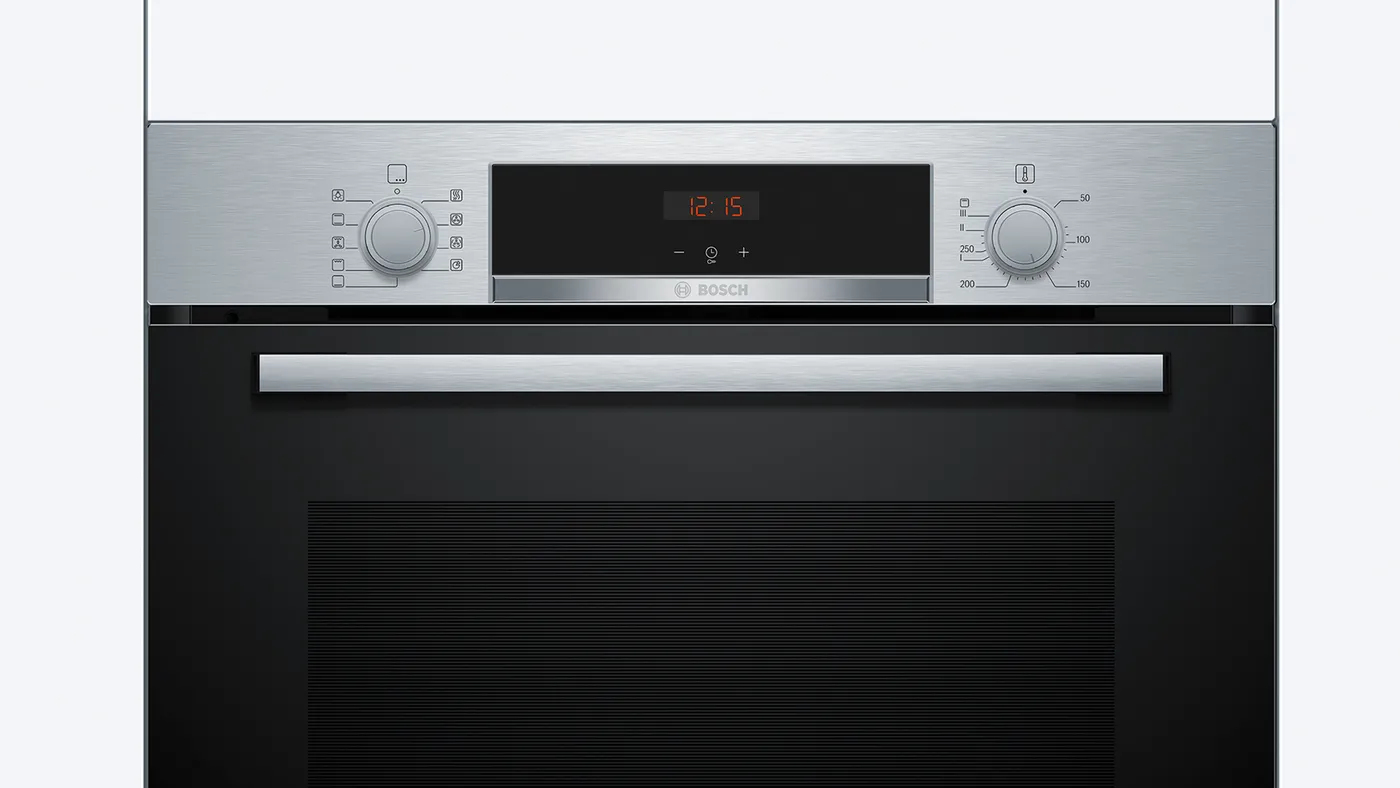 Bosch Serie 4 HBA534ES3. Grootte oven: Middelmaat, Soort oven: Elektrische oven, Totale binnen capaciteit (ovens): 71 l. Apparaatplaatsing: Ingebouwd, Kleur van het product: Zwart, Roestvrijstaal, Soort bediening: Draaiknop. Soort klok: Elektronisch, Type timer: Digitaal. Energieverbruik (conventioneel): 0,94 kWu, Energieverbruik (geforceerde convectie): 0,69 kWu, Energie-efficiëntieschaal: A+++ tot D. Bosch-technologieën (koken): Eco Clean Direct