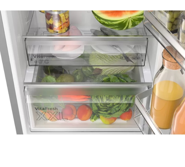 Bosch Serie 4 KGN392ICF. Totale nettocapaciteit: 363 l, Klimaatklasse: SN-T, Geluidsniveau: 35 dB. Nettocapaciteit koelkast: 260 l. Nettocapaciteit vriezer: 103 l, Vriescapaciteit: 10 kg/24u. Energie-efficiëntieklasse: C, Jaarlijks energieverbruik: 162 kWu. Kleur van het product: Roestvrijstaal