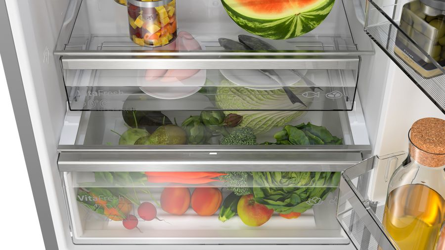 Bosch Serie 6 KGN49LBCF. Totale nettocapaciteit: 440 l. Deurscharnieren: Rechts, Type beeldscherm: LED. Klimaatklasse: SN-T, Geluidsniveau: 35 dB. Nettocapaciteit koelkast: 311 l, No Frost (koelkast), Multi-luchtwegsysteem (koelkast), Aantal planken koelkast: 5. Nettocapaciteit vriezer: 129 l, Vriescapaciteit: 11 kg/24u, No Frost (vriezer). Energie-efficiëntieklasse: C, Jaarlijks energieverbruik: 178 kWu. Kleur van het product: Zwart