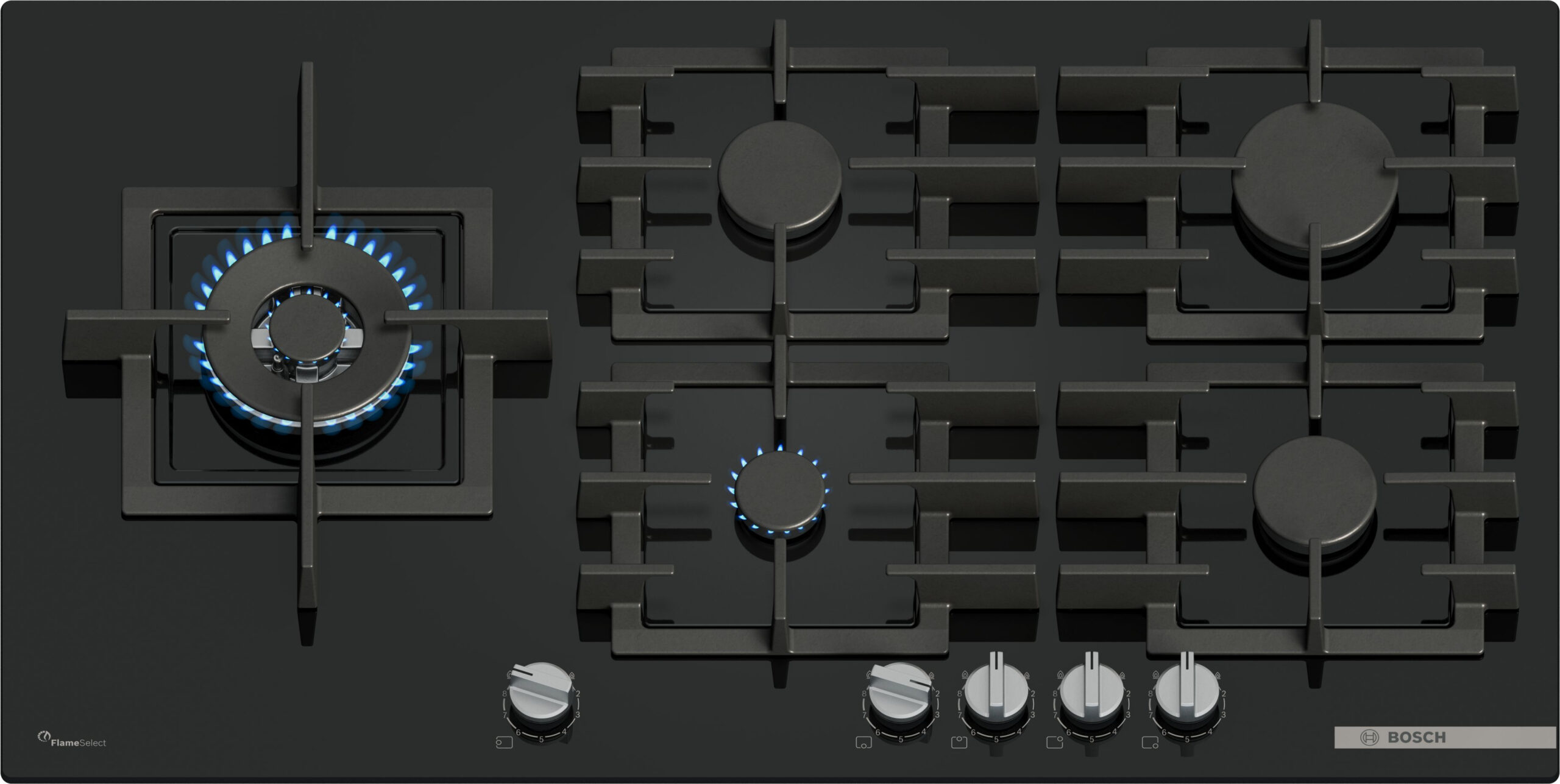 Bosch Serie 6 PPM9A6I40, Zwart, Ingebouwd, 90 cm, Gaskookplaat, Gehard glas, 5 zone(s)