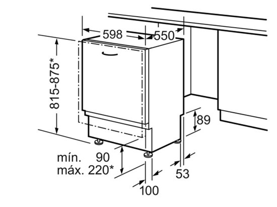 Bosch SMV41D10EU. Apparaatplaatsing: Volledig ingebouwd, Kleur bedieningspaneel: Zwart, Roestvrijstaal, Soort bediening: Knoppen. Aantal couverts: 12 couverts, Geluidsemissieklasse: C, Geluidsniveau: 48 dB. Energie-efficiëntieklasse: E, Waterconsumptie per cyclus: 10 l, Energieverbruik per 100 cycli: 92 kWu. Breedte: 598 mm, Diepte: 550 mm, Hoogte: 815 mm