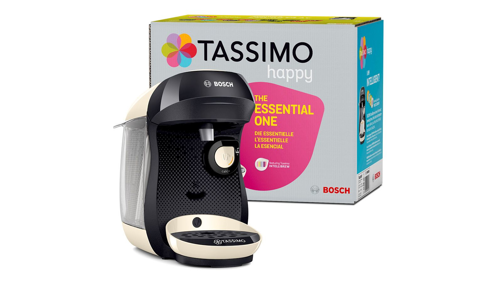 Bosch Tassimo Happy TAS1007. Type product: Filterkoffiezetapparaat, Koffiezet apparaat type: Volledig automatisch, Capaciteit watertank: 0,7 l, Koffie invoertype: Koffiecapsule, Reservoir voor gezette koffie: Beker, Aantal spuiten: 1. Vermogen: 1400 W. Kleur van het product: Zwart, Crème