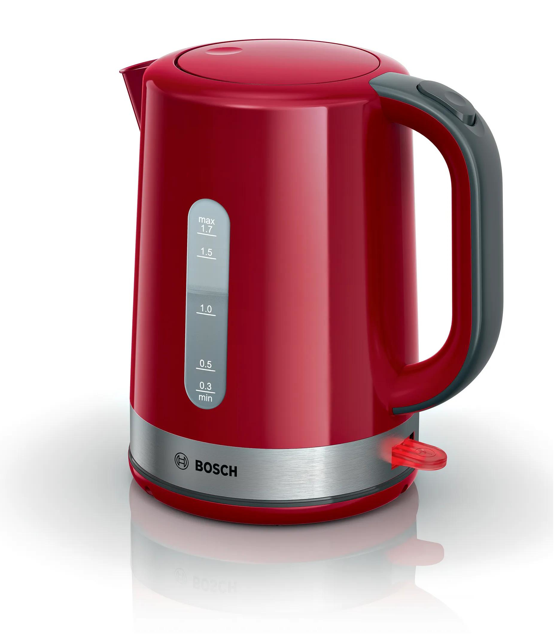 Bosch TWK6A514. Capaciteit watertank: 1,7 l. Vermogen: 2200 W. Kleur van het product: Grijs, Rood, Materiaal behuizing: Kunststof, Roestvrijstaal, Waterniveau-indicator, Oververhittingsbeveiliging. Draadloos