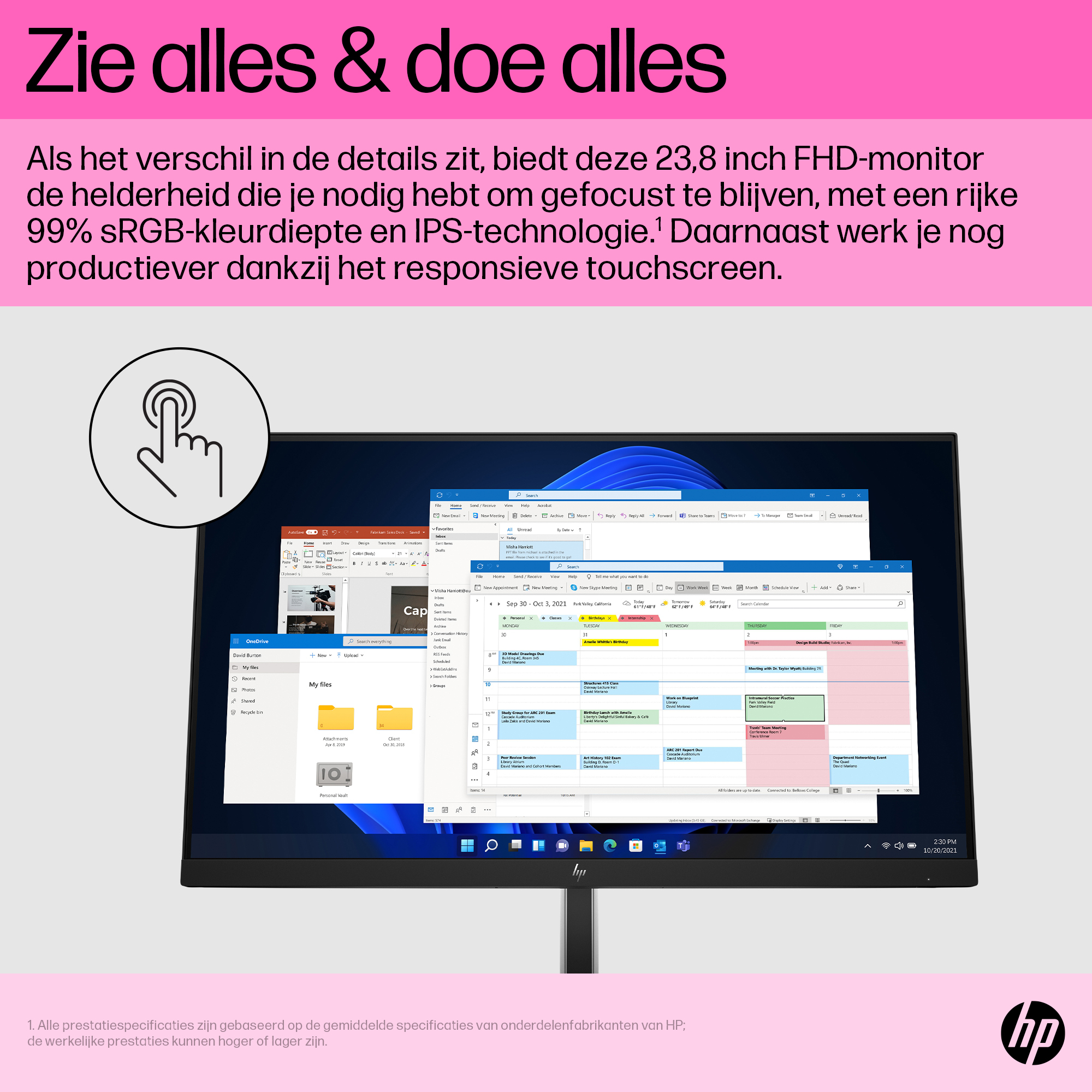 De HP E24t G5 FHD Touch Monitor is met opzet vervaardigd voor haarfijne beelden, persoonlijk comfort en echte flexibiliteit thuis en op kantoor, en geeft een nieuwe invulling aan het begrip comfort. Er staat je dus niets meer in de weg om optimaal te presteren.