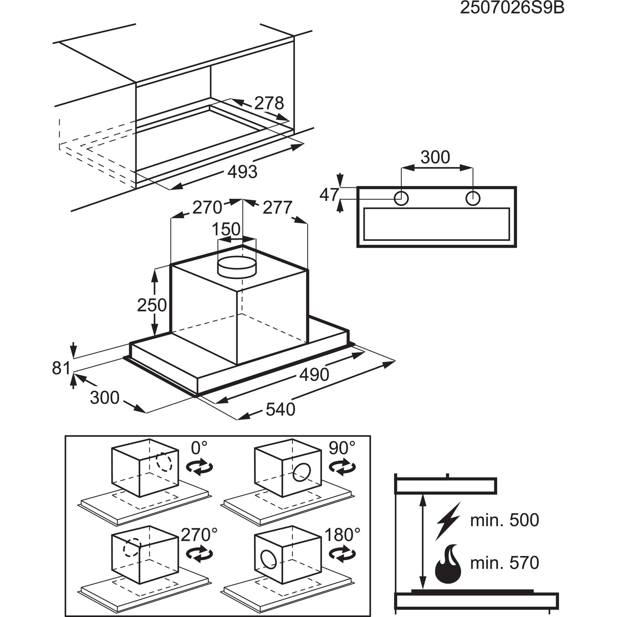 Electrolux LFG716X. Maximale afzuigcapaciteit: 700 m³/uur, Afzuigmethode: Afvoerend/recirculerend, Fluid dynamic efficiency class: A. Soort: Inbouw, Kleur van het product: Roestvrijstaal, Soort bediening: Knoppen. Soort vetfilter: Metaal. Vermogen lamp: 5 W, Aantal lampen: 2 gloeilamp(en), Type lamp: LED. Energie-efficiëntieklasse: A, Jaarlijks energieverbruik: 55 kWu, Energie-efficiëntieschaal: A+++ tot G