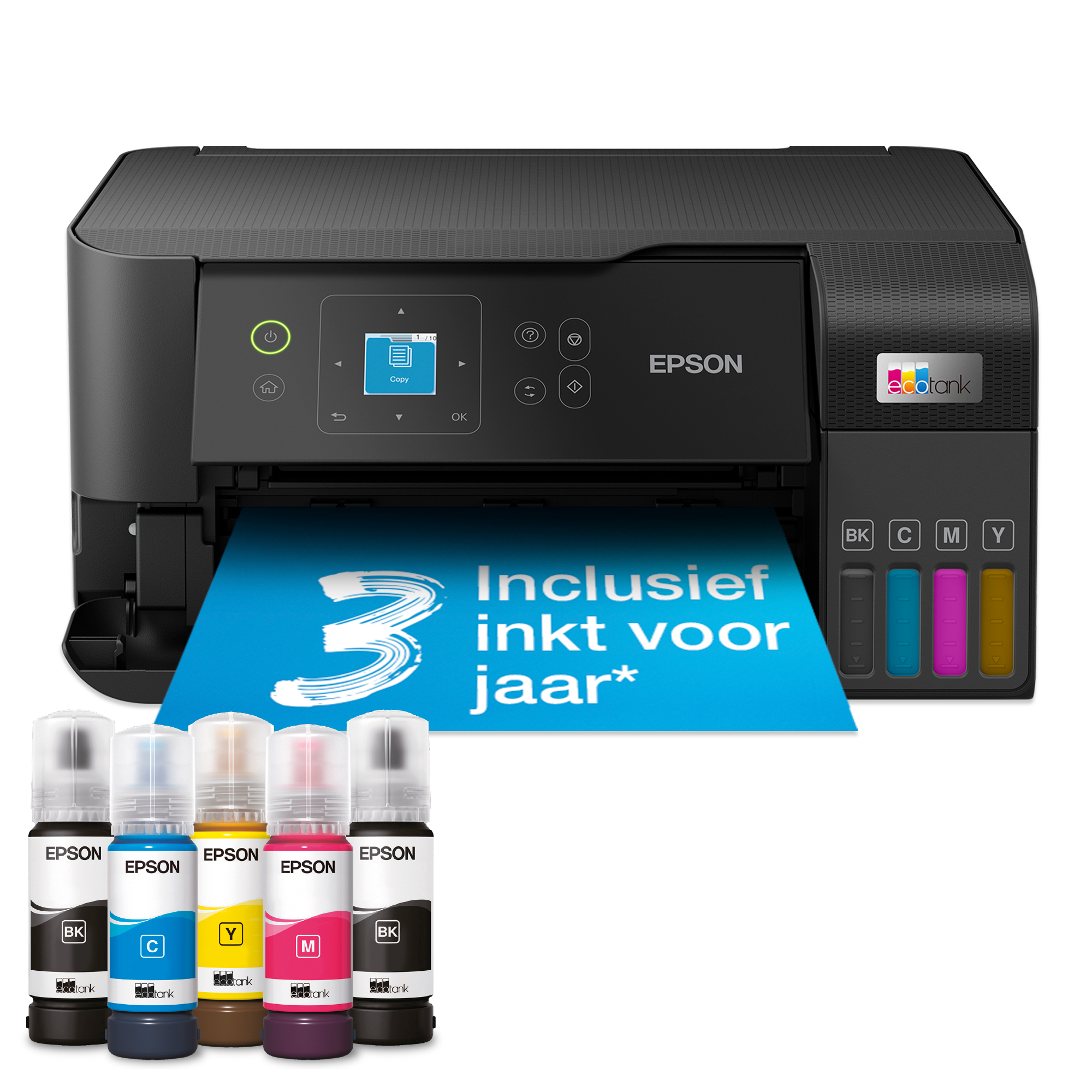Bespaar tot 90% op de inktkosten* met een EcoTank-printer met inkttanknnDeze A4-inkjetprinter met gebruiksvriendelijk scherm is perfect voor moderne, drukke huishoudens en wordt geleverd met een set inktflessen, wat hetzelfde is als maximaal 72 cartridges*. Met de navulbare inkttanks zijn de printkosten per pagina uitzonderlijk laag. Extra voordelen zijn mobiel printen, Wi-Fi, kopiëren en scannen.nn- Verlaag uw kosten met 90%1n- Zeer voordelig printenn- Printen, kopiëren en scannennnBespaar tot wel 90% op uw printkosten* met Epson EcoTank-printers zonder cartridges. Dankzij de speciaal ontworpen inktflessen met hoog rendement kunnen de geïntegreerde inkttanks eenvoudig worden gevuld. Zonder cartridges maar met de flexibele connectiviteitsfuncties en dubbelzijdig printen, is dit de perfecte printer voor iedereen die tegen ongelofelijk lage kosten per pagina in hoge kwaliteit wil printen.nnCartridges behoren tot het verledennMet EcoTank kunt u probleemloos thuis printen. U kunt de inkttanks met hoge capaciteit gemakkelijk en snel bijvullen. De flessen hebben een sleutelvergrendeling waardoor ze alleen op de juiste kleur kunnen worden gebruikt.nnBlijf besparennMet deze voordelige printer bespaart u tot wel 90% op uw printkosten.* Hij wordt geleverd met inkt voor maximaal 3 jaar.* Met één set inktflessen kunnen tot wel 4500 pagina’s in zwart-wit en 7500 pagina’s in kleur worden afgedrukt*. Dat is hetzelfde als maximaal 72 cartridges!*nnEpson Smart Panel-appnMet deze app kunt u uw printer bedienen vanaf uw smart device.*. U kunt documenten en foto’s afdrukken, kopiëren en scannen, uw printer instellen, controleren en problemen oplossen, en uw creativiteit de vrije loop laten met een breed scala aan artistieke sjablonen.nnBoordevol functiesnMet een lcd-scherm van 3,7 cm, een papierlade voor honderd pagina’s aan de achterkant, de mogelijkheid om foto’s randloos te printen (tot 10 x 15 cm) en een printsnelheid tot wel tien pagina’s per minuut* kunt u met gemak een groot aantal taken uitvoeren in korte tijd.nnModerne flexibiliteitnDankzij het compacte design en volledige Wi-Fi- en Wi-Fi Direct-connectiviteit kunt u deze printer eenvoudig in uw huidige thuissituatie integreren en vanaf mobiele telefoons, tablets en laptops printen*.nnSerieus over duurzaamheidnMet de warmtevrije PrecisionCore-technologie profiteert u van een lager energieverbruik en zijn minder vervangende onderdelen nodig. Onze unieke Heat-Free-technologie betekent geen opwarmtijd en minder stroomverbruik, en omdat de printkop vooraf is geïnstalleerd, is het configureren van uw printer een fluitje van een cent. nn*Zie epson.nl/ecotankfootnotes