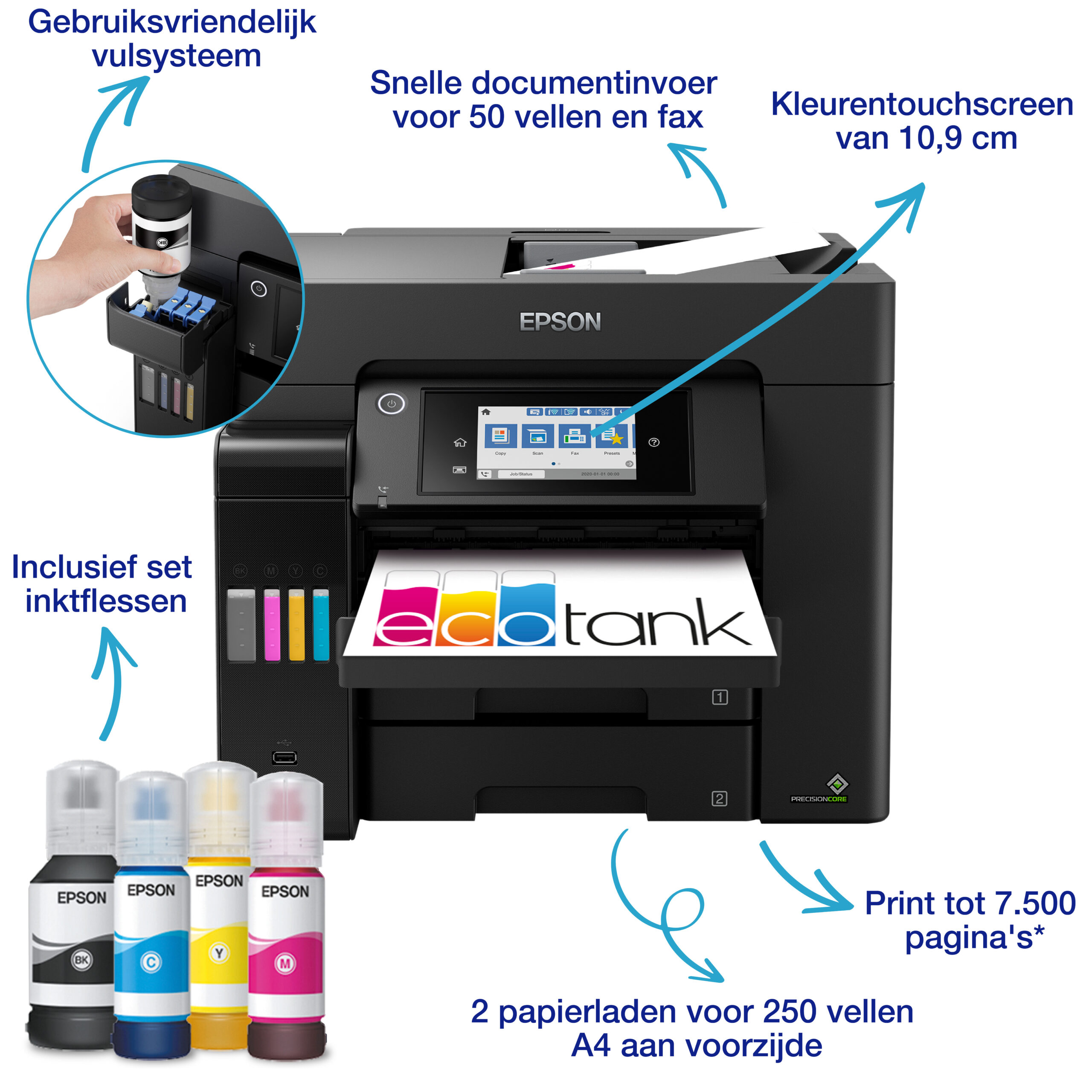 Print tot wel 7500 pagina’s in zwart-wit en 6000 pagina’s in kleur af met één set vervangende inkten*nnDeze snelle, multifunctionele A4 EcoTank is een must-have voor bedrijven en beschikt over een papierlade voor 500 vellen, een lade voor 50 vellen aan de achterkant, automatische documentinvoer voor 50 vellen en fax. De navulbare inkttanks bieden een zeer voordelige printoplossing voor kantoren.nnPrint, scan, kopieer en fax met deze gebruiksvriendelijke EcoTank-printer, die uitzonderlijk lage kosten per pagina biedt. A4-printtaken kunnen snel worden uitgevoerd dankzij hoge print- en scansnelheden, twee papierladen aan de voorkant voor 250 vellen A4, een papierlade aan de achterkant voor 50 vellen en een ADF voor 50 vellen A4. Print hoe u wilt met mobiel printen, Ethernet en een LCD-touchscreen van 10,9 cm.nnDoe meer in minder tijdnBlijf de concurrentie een stap voor met deze snelle en efficiënte printer die al binnen 5,5 seconden de eerste pagina kan printen.* En dankzij snel dubbelzijdig printen en een snelle automatische documentinvoer kunt u uw dagelijkse taken razendsnel afronden. nnFunctierijke A4 EcoTanknDe ET-5850 is ontworpen voor printen, scannen, kopiëren en faxen op A4-formaat. Functies zijn eenvoudig te selecteren dankzij het LCD-touchscreen.nnBlijf besparennBespaar elke keer dat u print met deze EcoTank dankzij de ongelooflijk lage kosten per pagina. Anders dan andere printers is de EcoTank voorzien van grote inkttanks die u kunt vullen met betaalbare inktflessen.nnGeen onderbrekingen meernDe EcoTank kan duizenden pagina’s printen voordat de inkt moet worden bijgevuld en de twee papierladen bieden ruimte voor 500 vellen. Hierdoor is bijvullen amper nodig. Handmatig pagina’s invoeren is niet meer nodig dankzij de ruime papierlade voor 50 vellen aan de achterkant en de A4-ADF. nnPrinten vanaf vrijwel elke locatienMet Wi-Fi en Wi-Fi Direct kunt u documenten verzenden om te printen vanaf smart devices met behulp van de Epson iPrint- en Smart Panel-apps.* Beschikt ook over Ethernet.nnGebruiksvriendelijk en betrouwbaar nHet vullen van de grote inkttanks aan de voorkant is eenvoudig dankzij de hersluitbare, intuïtieve en druppelvrije inktflessen. Deze printer gebruikt de warmtevrije PrecisionCore-printkop, die bekend staat om zijn snelheid, kwaliteit, betrouwbaarheid en efficiëntie en die de gehele levensduur van de printer meegaat.nn*Zie epson.nl/ecotankfootnotes