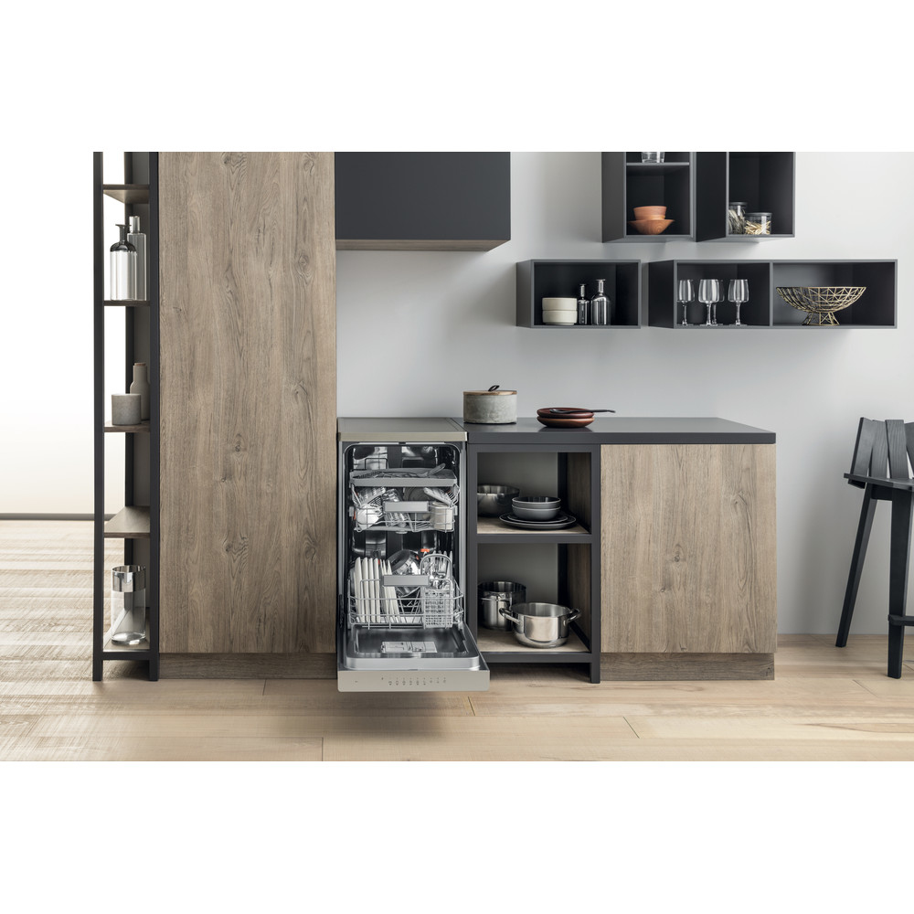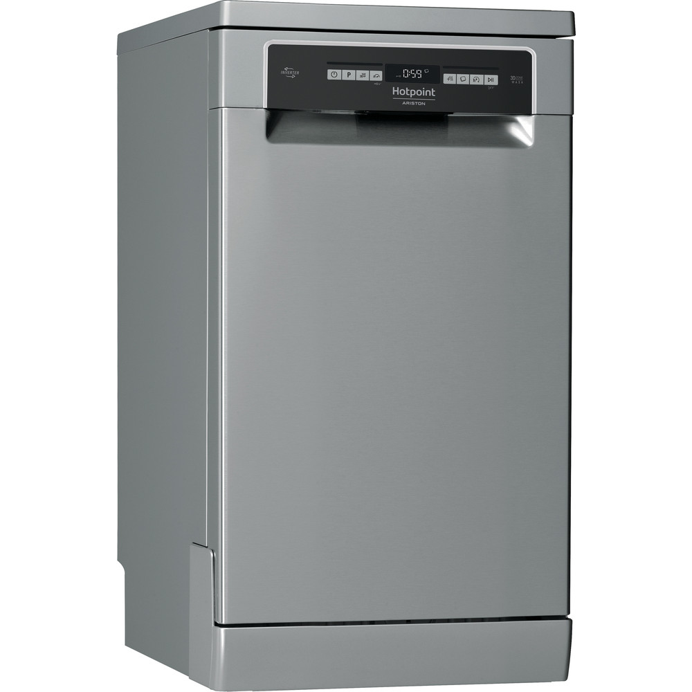 Hotpoint HSFO 3T223 WC X. Apparaatplaatsing: Vrijstaand, Productafmeting: Slimline (45 cm), Deurkleur: Roestvrijstaal. Aantal couverts: 10 couverts, Geluidsemissieklasse: B, Geluidsniveau: 43 dB. Energie-efficiëntieklasse: E, Waterconsumptie per cyclus: 9 l, Energieverbruik per 100 cycli: 76 kWu. Breedte: 450 mm, Diepte: 590 mm, Hoogte: 850 mm. Gewicht verpakking: 41,5 kg