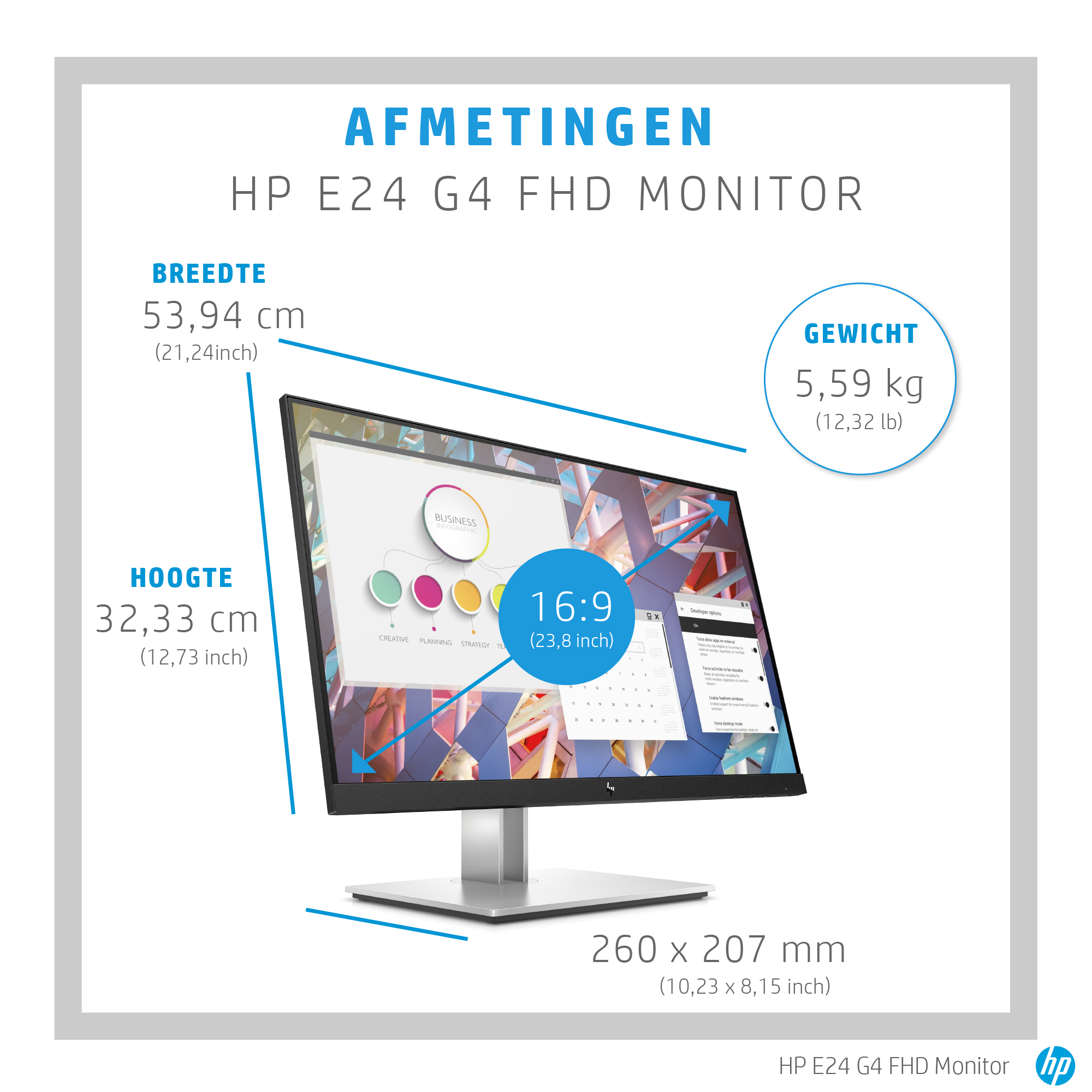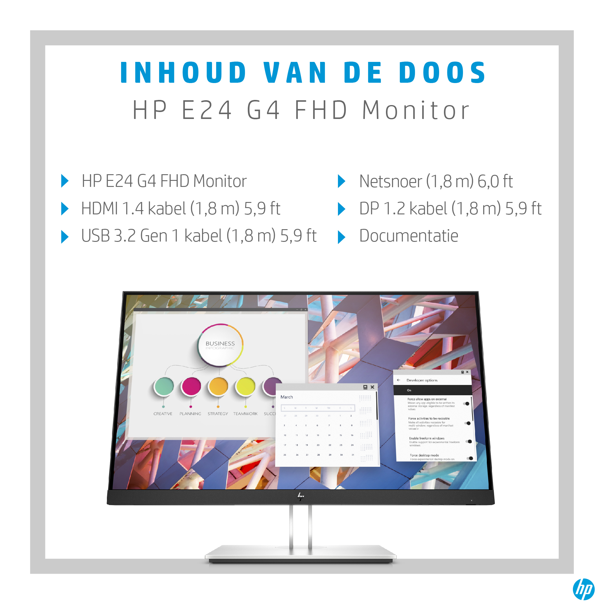 Puur comfort begint bij HP Eye Ease||Geef uw ogen de hele dag door rust met HP Eye Easy: onze eerste ingebouwde, altijd actieve blauwe lichtfilter die uw levendige inhoud weergeeft met zero impact op de kleurnauwkeurigheid en zonder OSD werkt.nnStel het scherm in zoals u dat wilt||Verlies geen enkel moment aan productiviteit met een monitor die in 4 richtingen kan worden afgesteld voor perfecte ergonomie, een flinterdunne rand aan drie zijden, en een niet-flikkerend 23,8 inch scherm (60,45 cm) waarop u meer tegelijkertijd kunt zien, met Full HD-resolutie voor haarscherp beeld vanuit elke hoek.nnOp een verantwoorde manier gemaakt||Energiezuinigheid is ingebouwd in elk ENERGY STAR®-gecertificeerd, EPEAT® 2020-geregistreerd[3] en laag-halogeen[4] display. We gaan nog een stap verder met 100% recyclebare verpakkingen die gemakkelijk worden geaccepteerd door recyclingbedrijven.nnEenvoudige, praktische aansluitmogelijkheden||Sluit uw meest gebruikte apparaten aan via VGA, HDMI en DisplayPort™. Sluit tot 4 USB-accessoires op de monitor aan met de ingebouwde USB 3.2-hub.nnKies een comfortabele positie||U werkt prettig dankzij de kantel-, hoogte- en draaimogelijkheden. Met de rotatiefunctie kunt u met gemak een staande of liggende weergave kiezen bij gebruik van meerdere monitors. [2]nnPas uw monitor naar wens aan en kies voor optimale beveiliging||Personaliseer uw monitor en help diefstal te voorkomen met de handige HP Display Center-software waarmee u de instellingen en partities kunt instellen, en uw scherm kunt dimmen als het zonder toestemming wordt afgekoppeld; dit alles via de host pc. [6]nnMaak het plaatje compleet||Personaliseer een totaaloplossing met opties zoals de HP S101 speakerbalk, die eenvoudig aan de onderste rand kan worden bevestigd om stereogeluid aan het scherm toe te voegen. [5]nnWij hebben wat u zoekt||U kunt er zeker van zijn dat deze monitor uitvoerig is getest op compatibiliteit met HP pc’s en workstations. Tevens is onze standaardgarantie van 3 jaar van toepassing. Bescherm u tegen onopzettelijke schade en profiteer van support op de volgende werkdag en meer met de optionele HP Care Pack-services. [7]
