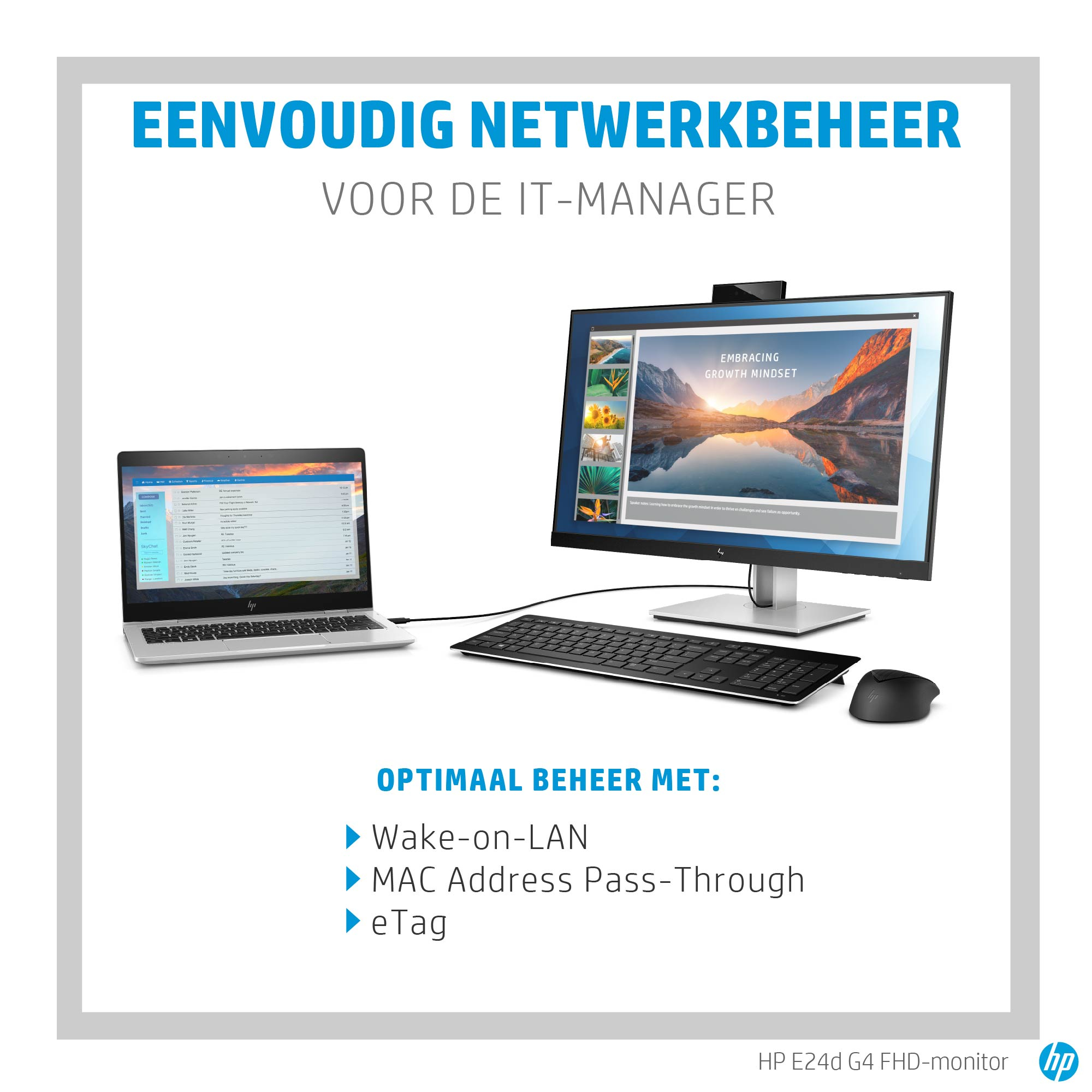 U kunt met plezier aan uw bureau werken en IT op afstand uw HP apparaten laten beheren vanaf elke plek in het netwerk[2,3] met de gestroomlijnde USB-C™[1]-connectiviteit van de HP E24d G4 FHD Advanced dockingmonitor.