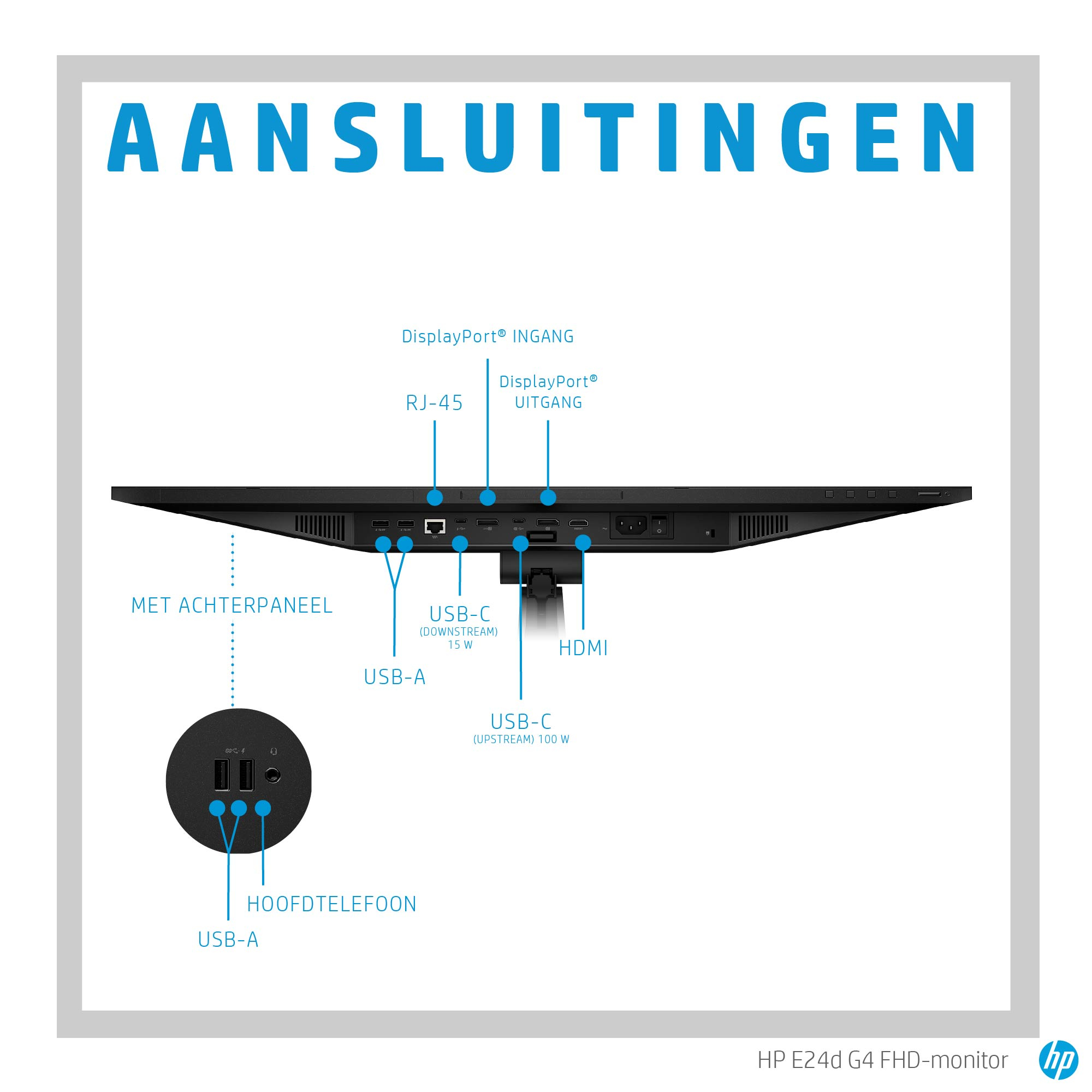 Creëer de ideale productiviteitshubnWerk met plezier aan uw bureau met de overzichtelijke aansluitmogelijkheden van de HP E24d G4 FHD Advanced dockingmonitor. Sluit uw dagelijkse accessoires aan op het display en voeg vervolgens uw pc toe met slechts één USB-C™[1]-kabel. Laat IT op afstand HP apparaten beheren vanaf elke plek in het netwerk via RJ-45.[2,3]