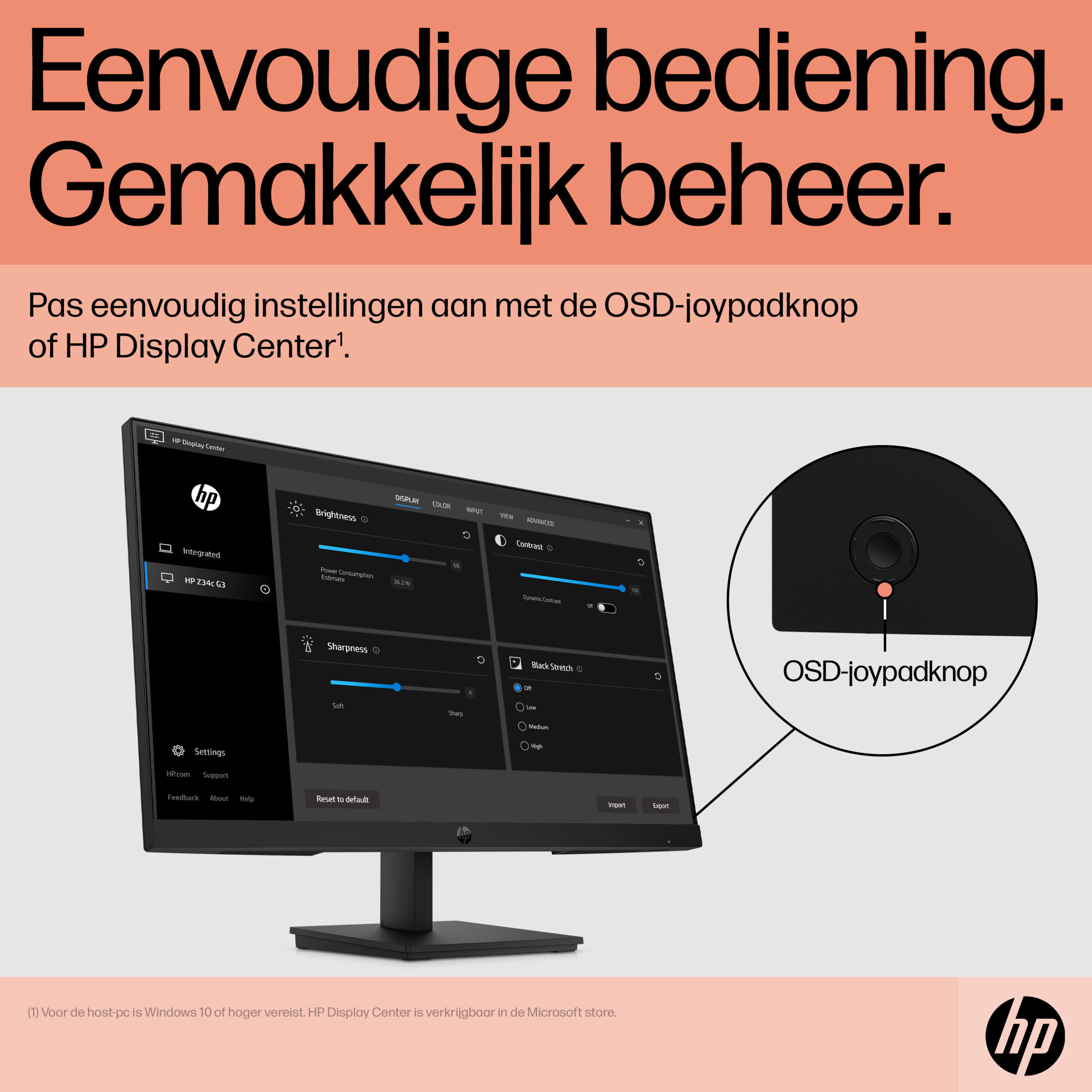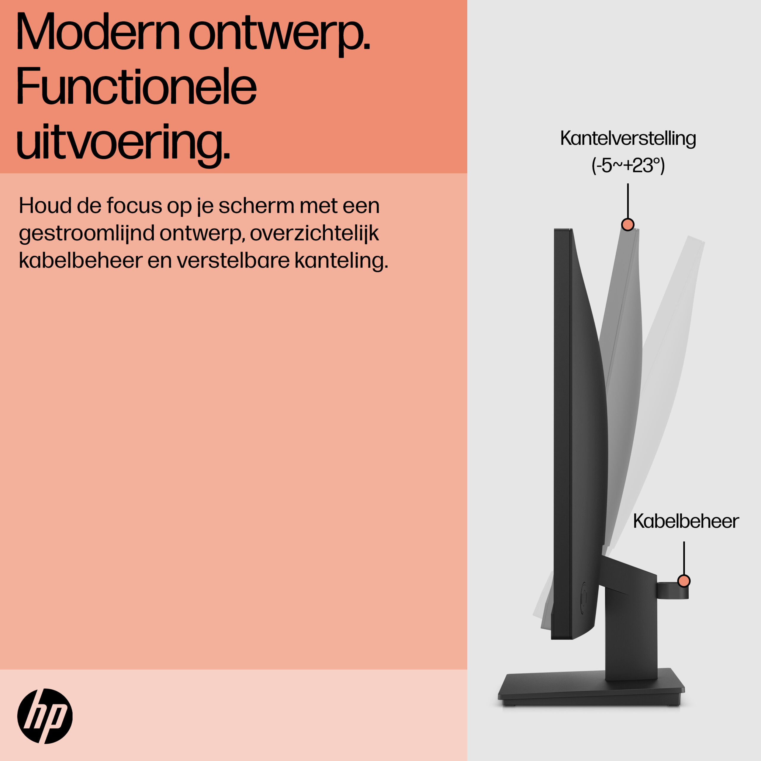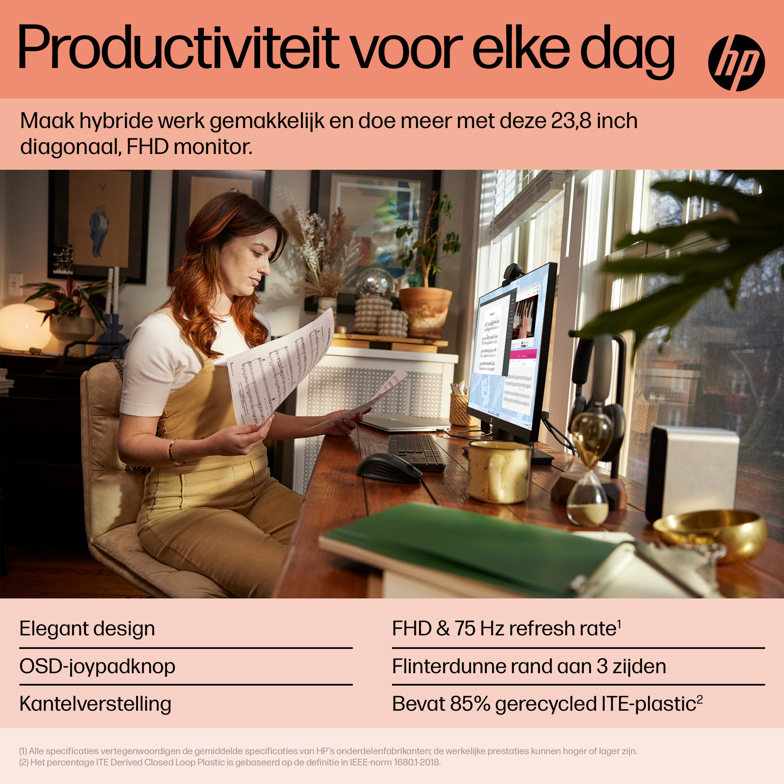 Maak hybride werken gemakkelijk en doe meer thuis of op kantoor met deze FHD-monitor met een diagonaal van 60,5 cm (23,8 inch), door een helder, vloeiend scherm en eenvoudige vormgeving.