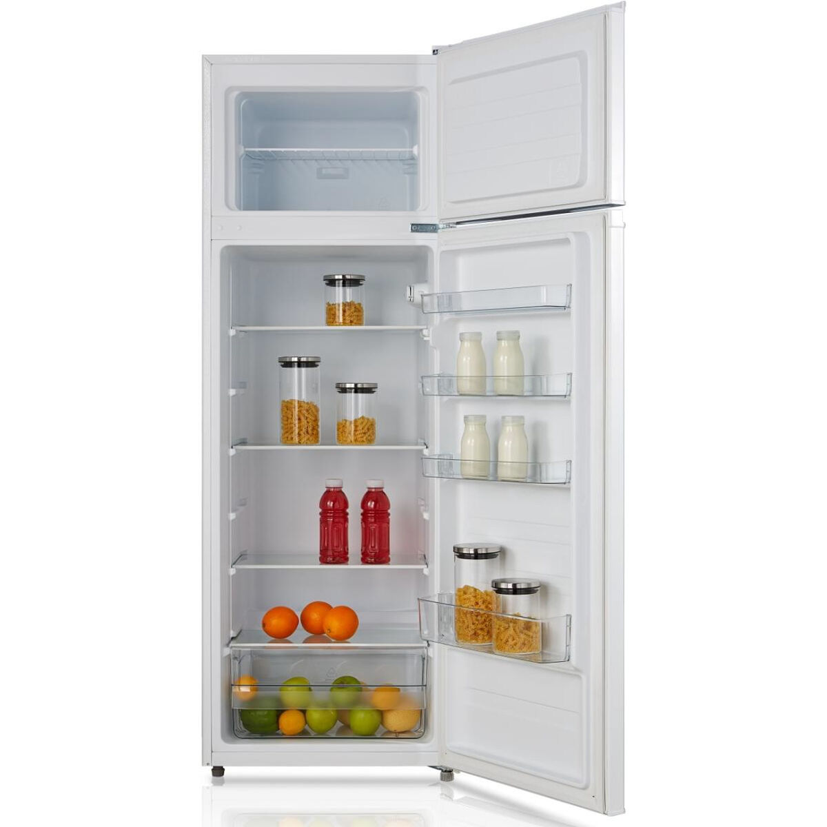 Deze strakke koelkast geeft je keuken een coole stijl. De ruime inhoud van 256 liter en de omkeerbare deuren bieden flexibele opbergmogelijkheden, terwijl je met de regelbare thermostaat de temperatuur kunt aanpassen om voedsel vers te houden. Twee binnenlampjes verlichten het interieur zodat je gemakkelijk kunt vinden wat je nodig hebt. De omkeerbare deuren en het flessenrek maken het makkelijk om drankjes en snacks te organiseren, en de stille werking van 42dB zal je niet storen terwijl het hard werkt om je boodschappen gekoeld te houden. Deze koelkast is gemaakt van duurzame materialen en heeft energieklasse F, waardoor hij jarenlang betrouwbaar en energiezuinig zal koelen. Voeg een vleugje moderne eenvoud toe aan je huis met deze ingetogen witte koelkast die je helpt je voedsel vers te houden op een slimme, milieuvriendelijke manier.