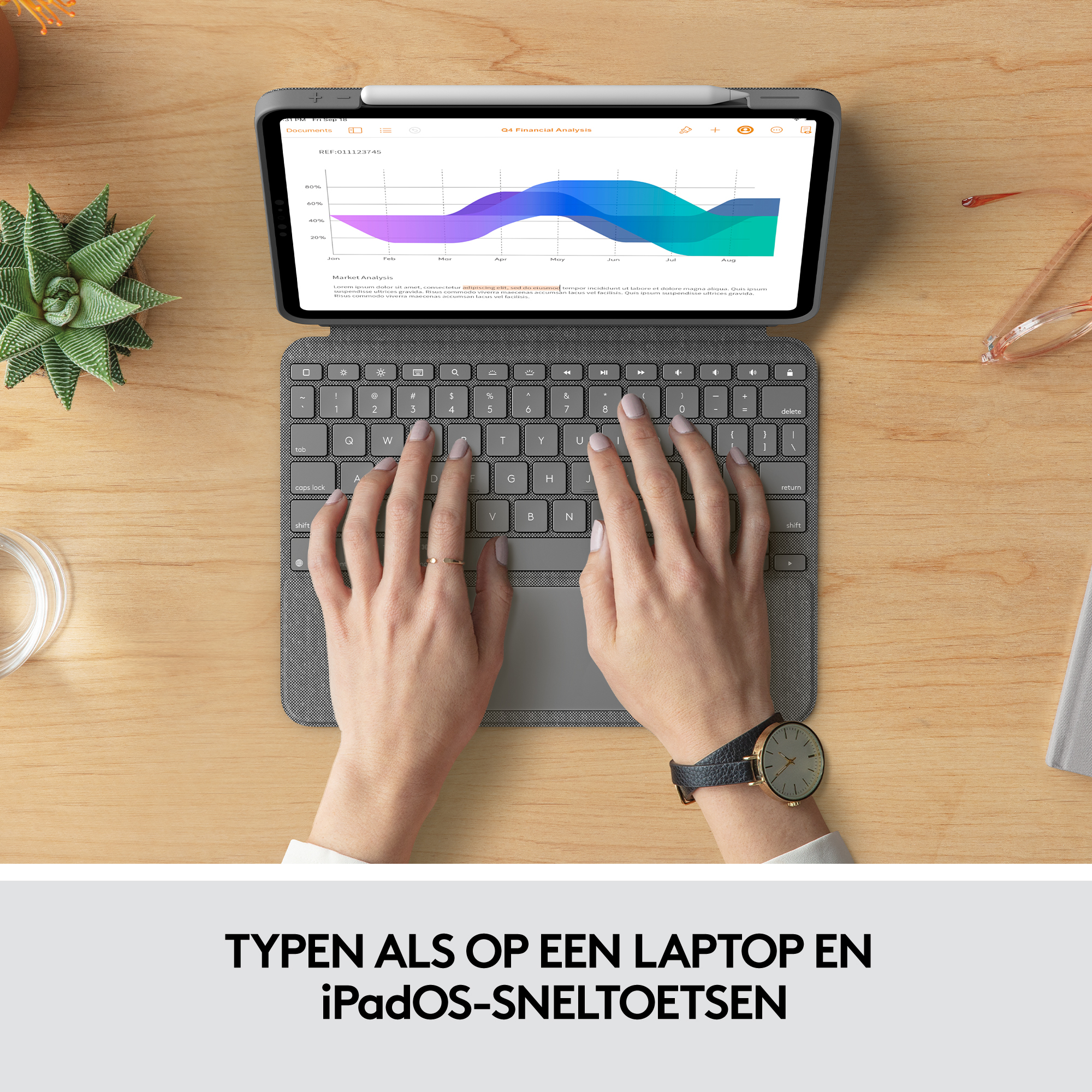 Logitech Combo Touch for iPad Pro 11-inch (1st, 2nd, and 3rd generation)nDit is geen laptop. Het is veel meer dan dat. Maak kennis met de Combo Touch voor iPad Pro 11″ (1e, 2e en 3e generatie), een ongelooflijk veelzijdige toetsenbordcase met een grote, overal klikbare trackpad en vier handige gebruiksmodi. Typen, weergeven, tekenen en lezen, allemaal terwijl je iPad goed wordt beschermd door de duurzame, perfect gevormde case. Werk dag en nacht met verlichte toetsen die zich automatisch aanpassen met 16 helderheidsniveaus, en profiteer van onmiddellijk aanzetten en koppelen dankzij de Smart Connector-technologie. In de Combo Touch vindt de iPad Pro zijn gelijke wat betreft het strakke, moderne ontwerp: het is onze dunste toetsenbordcase met een trackpad tot nu toe.nnCompatibiliteitnLogitech Combo Touch-toetsenbordhoes is compatibel met iPad Pro 11-inch (1e, 2e, 3e generatie – 2018, 2020, 2021) – A1980, A2013, A1934, A1979, A2228, A2068, A2230, A2231nnDoe het allemaal met Combo Touchnmet vier veelzijdige gebruiksmodi kunt u typen, schetsen, bekijken en lezen zonder ooit uw iPad Pro uit de toetsenbordhoes te hoeven halennnAfneembaar toetsenbord en verstelbare standaardnverwijder het toetsenbord als u klaar bent met typen voor meer flexibiliteit en geniet van 50 graden instelbare kijkhoekennnGroot, click-anywhere-trackpadndeze iPad-toetsenbordhoes heeft een responsief en betrouwbaar trackpad. U kunt het hele oppervlak gebruiken om te werken en Multi-Touch-trackpadbewegingen uit te voerennnVerlicht, laptopachtig toetsenbordnde toetsen passen zich automatisch aan uw omgeving aan met 16 helderheidsniveaus en de iPadOS-sneltoetsen geven met één tik toegang tot volumeregeling en meernnBescherming aan de voorkant, achterkant en hoekenneen duurzame, verstelbare hoes beschermt de voorkant, achterkant en hoeken van de iPad Pro en houdt deze veilig, ongeacht wat u doetnnSMART CONNECTOR-technologienmaak u nooit zorgen over het opladen dankzij directe stroomvoorziening en koppeling met de Combo Touch-toetsenbordhoes; stroom wordt rechtstreeks van de iPad Pro gehaaldnnOok voor Apple Pencilnlaad uw Apple Pencil eenvoudig op terwijl u de hoes vasthoudt dankzij een handige opening aan de zijkant van de iPad Pro hoes