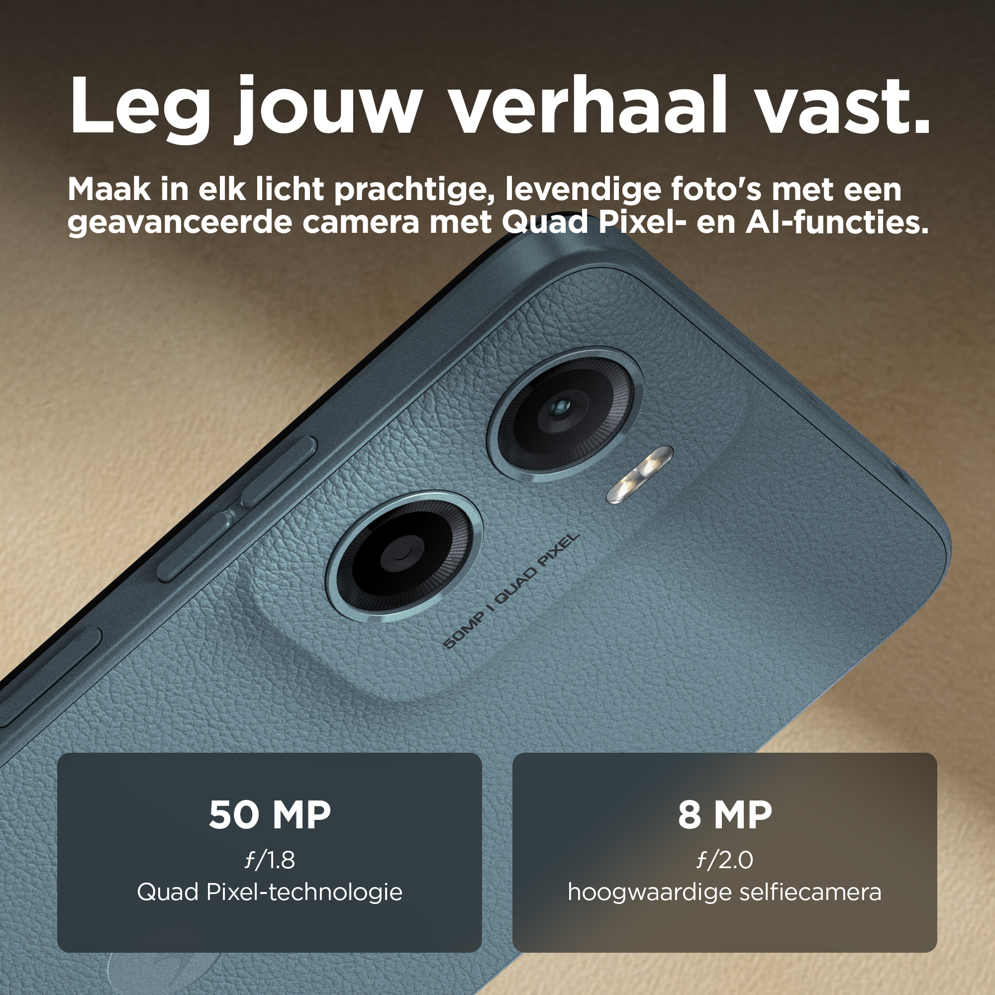Scherpere foto’s. Schitterende verhalen.nErvaar adembenemend beeld en geluid met de nieuwe moto g05. Kijk je favoriete series en films op een superhelder display van 6,67 inch zelfs buiten in het zonlicht. En luister naar geluid overal om je heen dankzij krachtige stereoluidsprekers met Basversterking. Maak prachtig scherpe foto’s, dag en nacht, met het Quad Pixel-camerasysteem van 50 MP(2) met AI-powered portret. Verhoog je snelheid met superefficiënte prestaties en maximaal 12 GB RAM beschikbaar met RAM-boost(5). Met een afwerking van vegan leer, een waterafstotend design(4) en Corning® Gorilla® Glass 3 gaat de stijlvolle moto g05 lang mee. Vertrouw op een accu van 5200 mAh met een lange accuduur + TurboPower™ opladen. En krijg heel veel opslag voor je content en creaties. De moto g05 is in elk opzicht geweldig.
