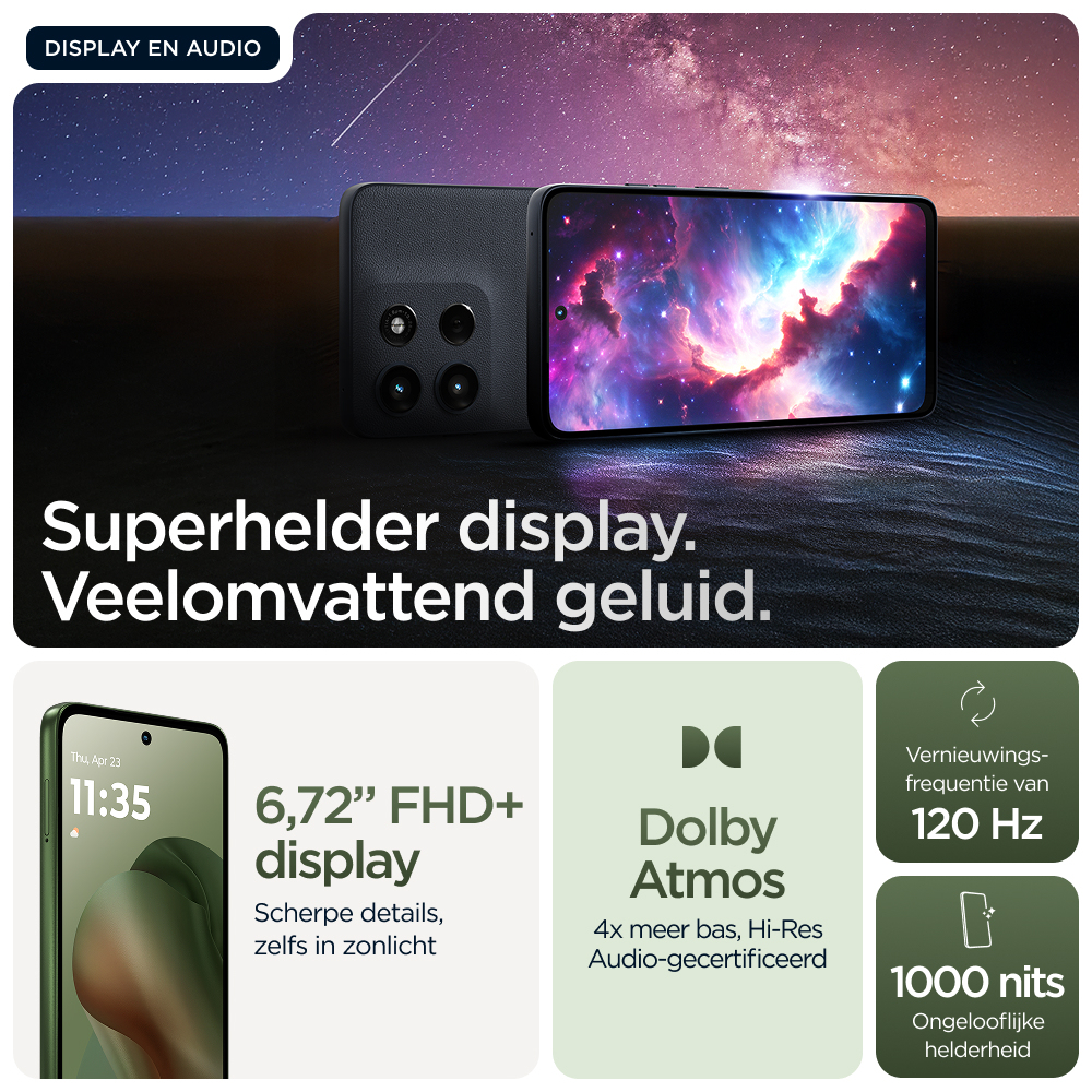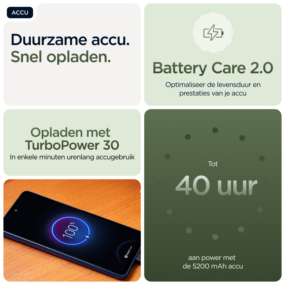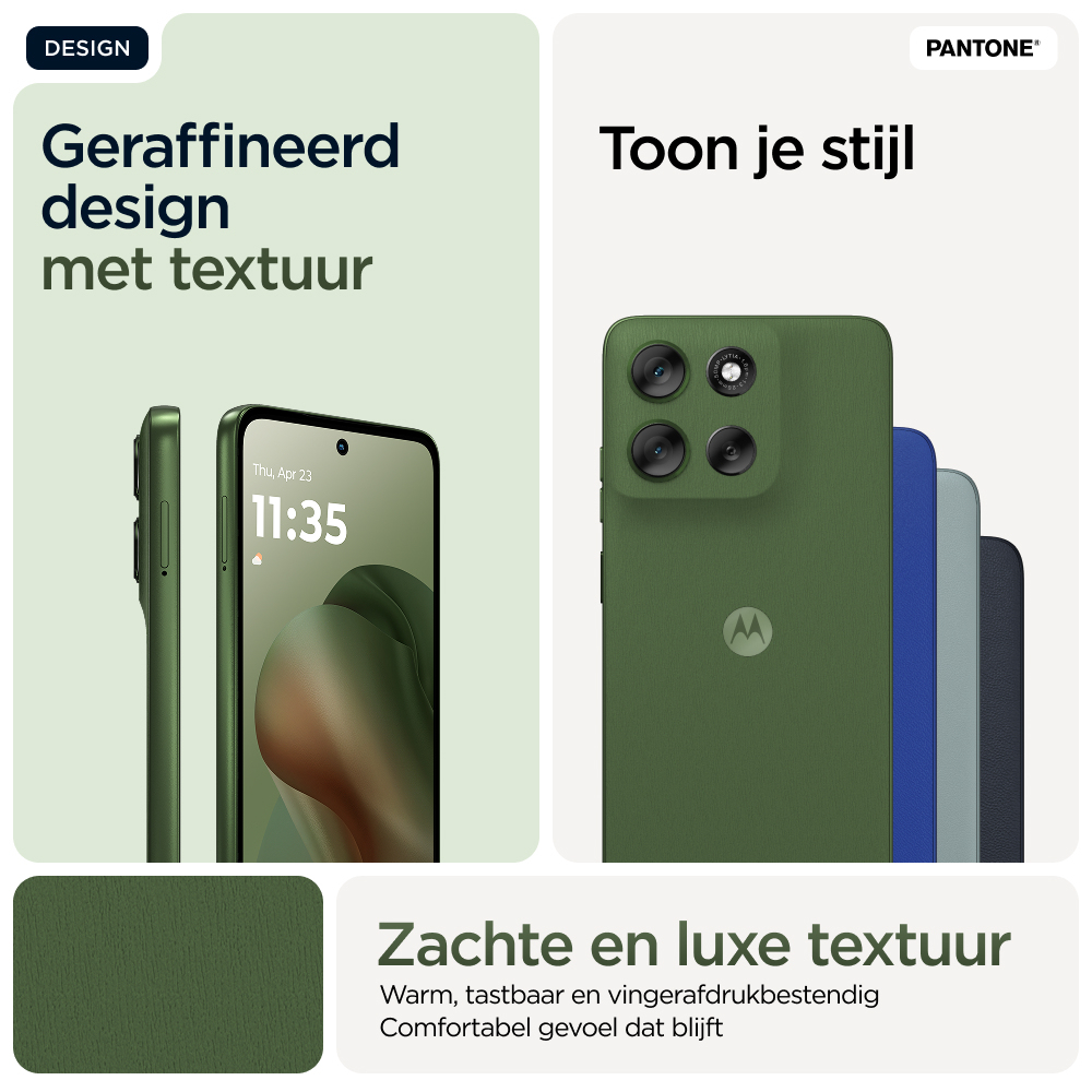 Stijlvol ontworpen. Duurzaam design.nMaak kennis met de moto g56 5G die een prachtig design combineert met praktische stevigheid. Geniet van het zachte gevoel van een eersteklas afwerking met een goede grip plus zorgeloze bescherming onder water, bestendigheid tegen extreme temperaturen en een krasbestendig scherm.(1,2) Entertainment ziet er nog beter uit op een superhelder FHD+-display van 6,72 inch aangevuld door krachtige stereoluidsprekers met Basversterking. Maak prachtige foto’s bij elk licht met een Sony LYTIA™-camera van 50 MP met de kracht van moto ai. Krijg urenlang stroom in slechts enkele minuten met razendsnel TurboPower™ opladen.(3,4) Ontketen de kracht van een octa-core processor met de snelheid van 5G.(5) En krijg meer dan genoeg opslagruimte voor foto’s, films, nummers en apps. De nieuwe moto g56 5G. Prachtig en robuust.