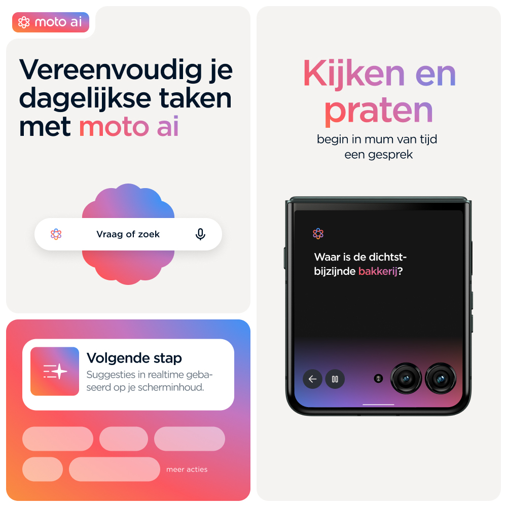 Make it iconicnKies voor slimmer. Kies voor sneller. Kies voor nog iconischer. Maak kennis met de motorola razr 60 ultra. Deze supercompacte en voortreffelijk vervaardigde flipphone is verkrijgbaar met opvallende afwerkingen zoals Alcantara(43) en echt hout, alle in speciaal geselecteerde Pantone-kleuren. Krijg eenvoudig toegang tot je favoriete apps op het meest intelligente en interactieve externe display. Dat alles zonder je smartphone open te klappen. Maak professionele foto’s en video’s en profiteer van persoonlijke hulp dankzij de naadloze integratie van moto ai(1). Alles gaat sneller met het toonaangevende Snapdragon® AI. En laad sneller op dan met elke andere flipphone(2) dankzij 68 W TurboPower™. De nieuwe motorola razr 60 ultra. Jouw toestel, jouw stijl.