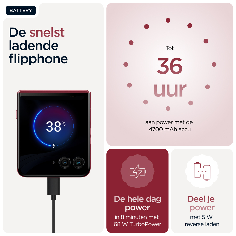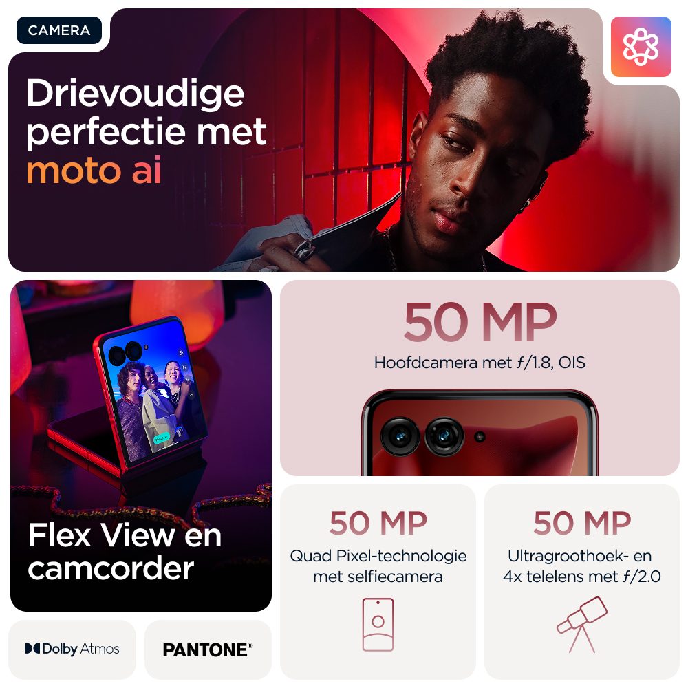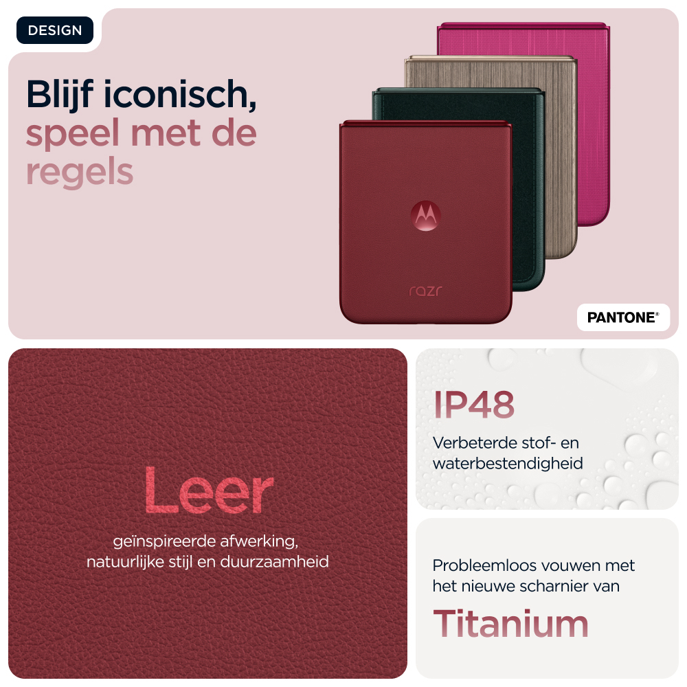 Make it iconicnKies voor slimmer. Kies voor sneller. Kies voor nog iconischer. Maak kennis met de motorola razr 60 ultra. Deze supercompacte en voortreffelijk vervaardigde flipphone is verkrijgbaar met opvallende afwerkingen zoals Alcantara(43) en echt hout, alle in speciaal geselecteerde Pantone-kleuren. Krijg eenvoudig toegang tot je favoriete apps op het meest intelligente en interactieve externe display. Dat alles zonder je smartphone open te klappen. Maak professionele foto’s en video’s en profiteer van persoonlijke hulp dankzij de naadloze integratie van moto ai(1). Alles gaat sneller met het toonaangevende Snapdragon® AI. En laad sneller op dan met elke andere flipphone(2) dankzij 68 W TurboPower™. De nieuwe motorola razr 60 ultra. Jouw toestel, jouw stijl.
