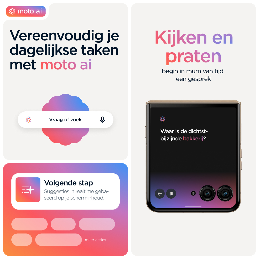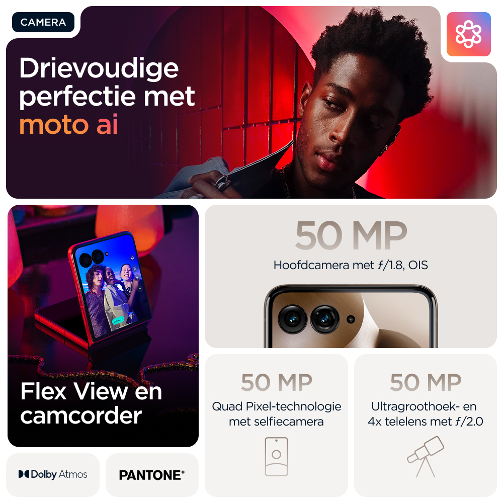 Make it iconicnKies voor slimmer. Kies voor sneller. Kies voor nog iconischer. Maak kennis met de motorola razr 60 ultra. Deze supercompacte en voortreffelijk vervaardigde flipphone is verkrijgbaar met opvallende afwerkingen zoals Alcantara(43) en echt hout, alle in speciaal geselecteerde Pantone-kleuren. Krijg eenvoudig toegang tot je favoriete apps op het meest intelligente en interactieve externe display. Dat alles zonder je smartphone open te klappen. Maak professionele foto’s en video’s en profiteer van persoonlijke hulp dankzij de naadloze integratie van moto ai(1). Alles gaat sneller met het toonaangevende Snapdragon® AI. En laad sneller op dan met elke andere flipphone(2) dankzij 68 W TurboPower™. De nieuwe motorola razr 60 ultra. Jouw toestel, jouw stijl.