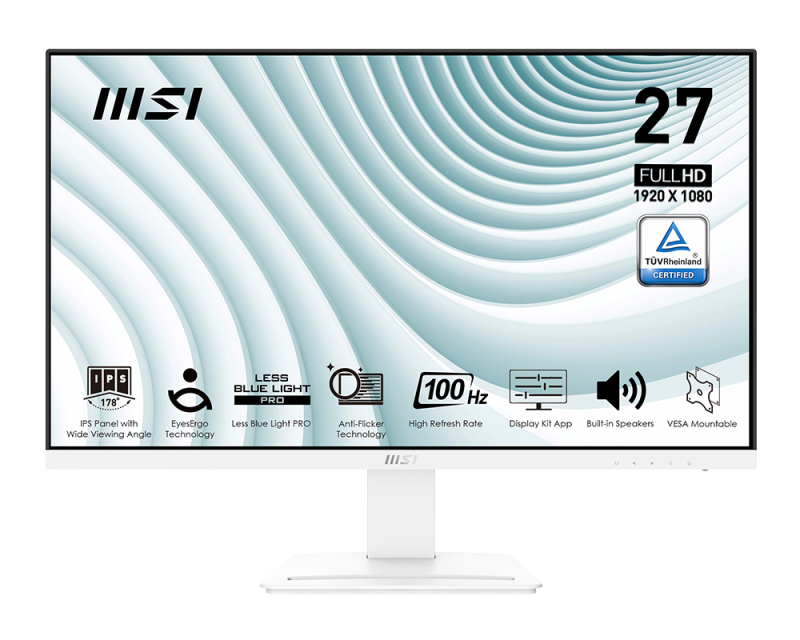 MSI Pro MP273AWDE. Beeldschermdiagonaal: 68,6 cm (27″), Resolutie: 1920 x 1080 Pixels, HD type: Full HD, Display technologie: LCD, Responstijd: 4 ms, Oorspronkelijke beeldverhouding: 16:9, Kijkhoek, horizontaal: 178°, Kijkhoek, verticaal: 178°. Ingebouwde luidsprekers. VESA-montage, In hoogte verstelbaar. Kleur van het product: Wit