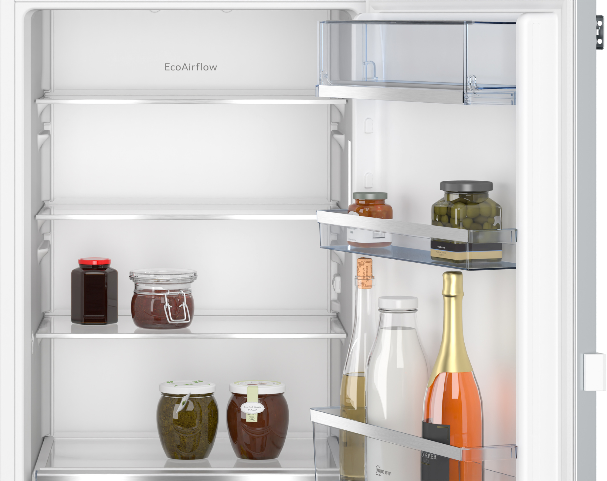 Neff KI1312FE0. Nettocapaciteit koelkast: 136 l, Klimaatklasse: SN-ST, Geluidsniveau: 35 dB. Aantal planken koelkast: 4, Aantal groente lades: 1. Soort lamp: LED. Deurscharnieren: Rechts. Jaarlijks energieverbruik: 96 kWu, Energie-efficiëntieklasse: E. Gewicht: 34,1 kg. Kleur van het product: Wit