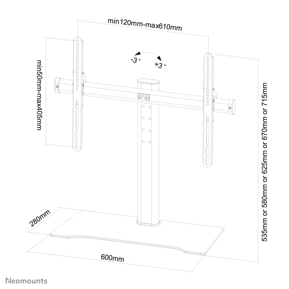 Neomounts monitor stand. Maximale gewichtscapaciteit: 40 kg, Minimale schermgrootte: 81,3 cm (32″), Maximale schermgrootte: 152,4 cm (60″), Montage interface compatibiliteit (min): 200 x 200 mm, Montage interface compatibiliteit (max): 600 x 400 mm. Hoogte verstelbaarheidsbereik: 575 – 715 mm. Kleur van het product: Zwart