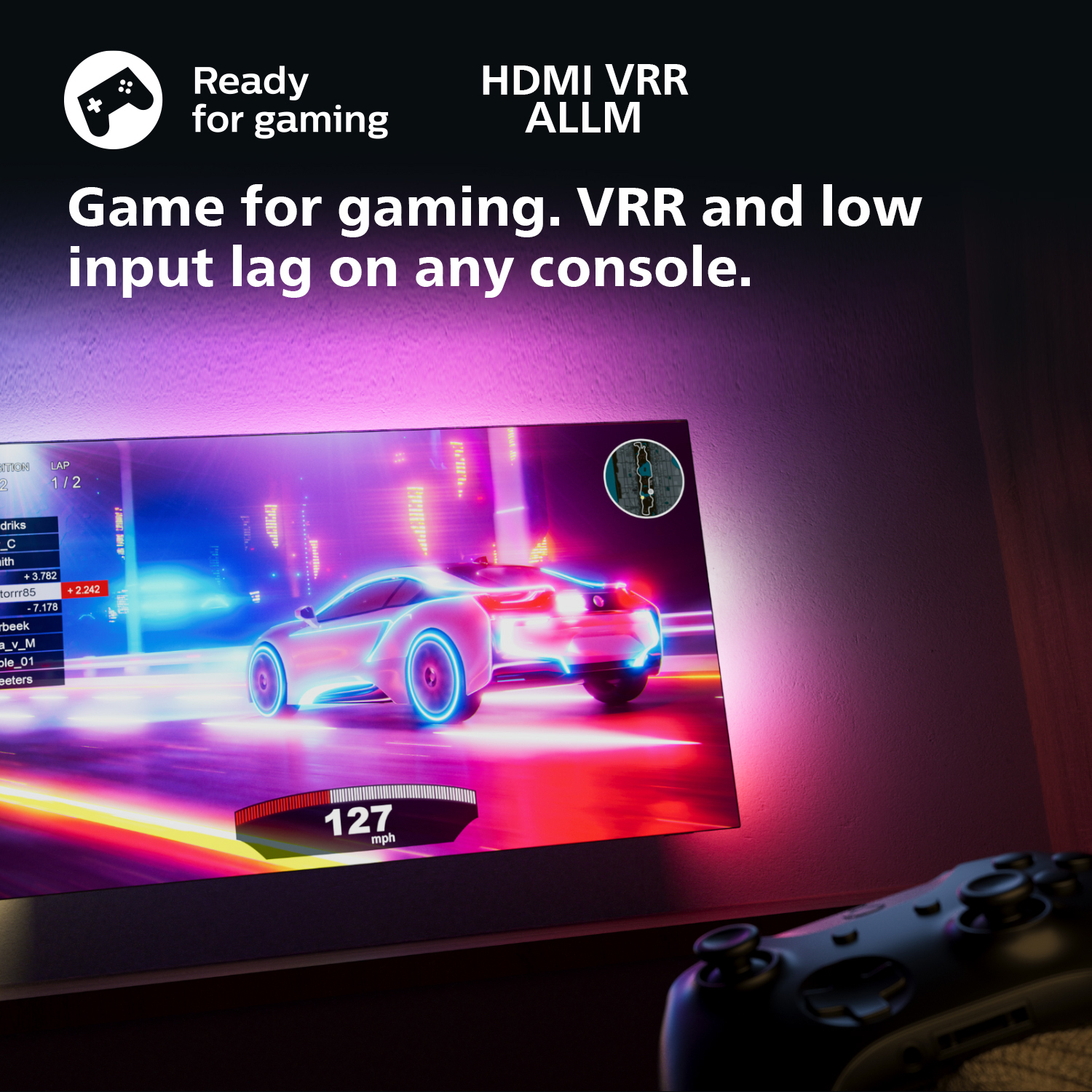 Dankzij de snelle gameplay en vloeiende graphics haalt u het beste uit uw console met HDMI 2.1. VRR wordt ondersteund en de instelling voor een lage invoervertraging wordt automatisch geactiveerd wanneer u uw console inschakelt. De Ambilight-gamemodus zorgt voor nog meer spanning.