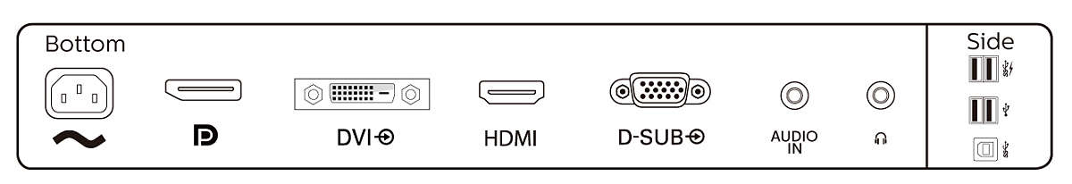 | Meegeleverde kabels | VGA, HDMI, DisplayPort, Audio (3.5 mm), AC |