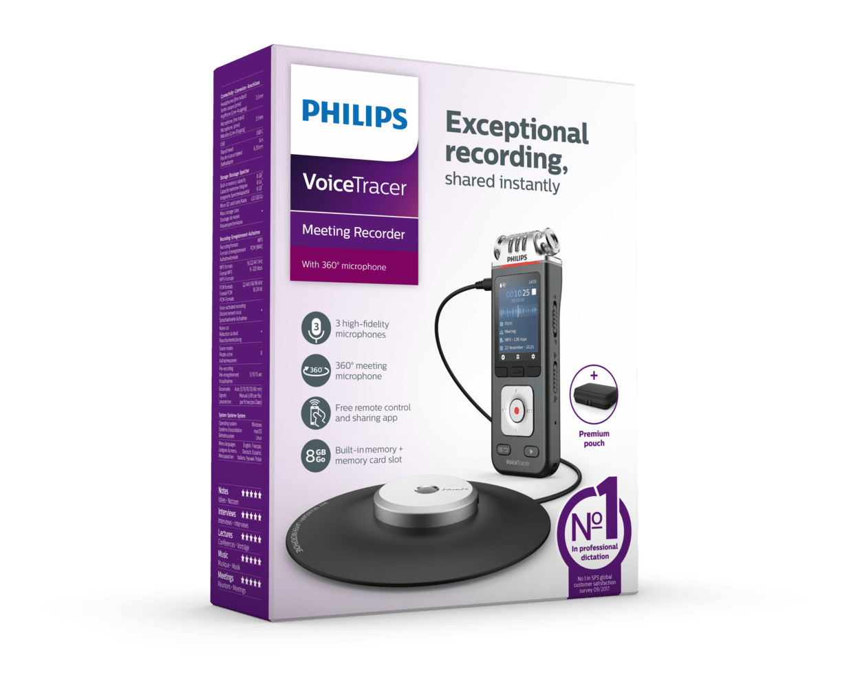 | Verpakkingsinhoud | Recorder, Quick start guide, USB-C cable, 360° meeting microphone with integrated line-in cable, Pouch |
