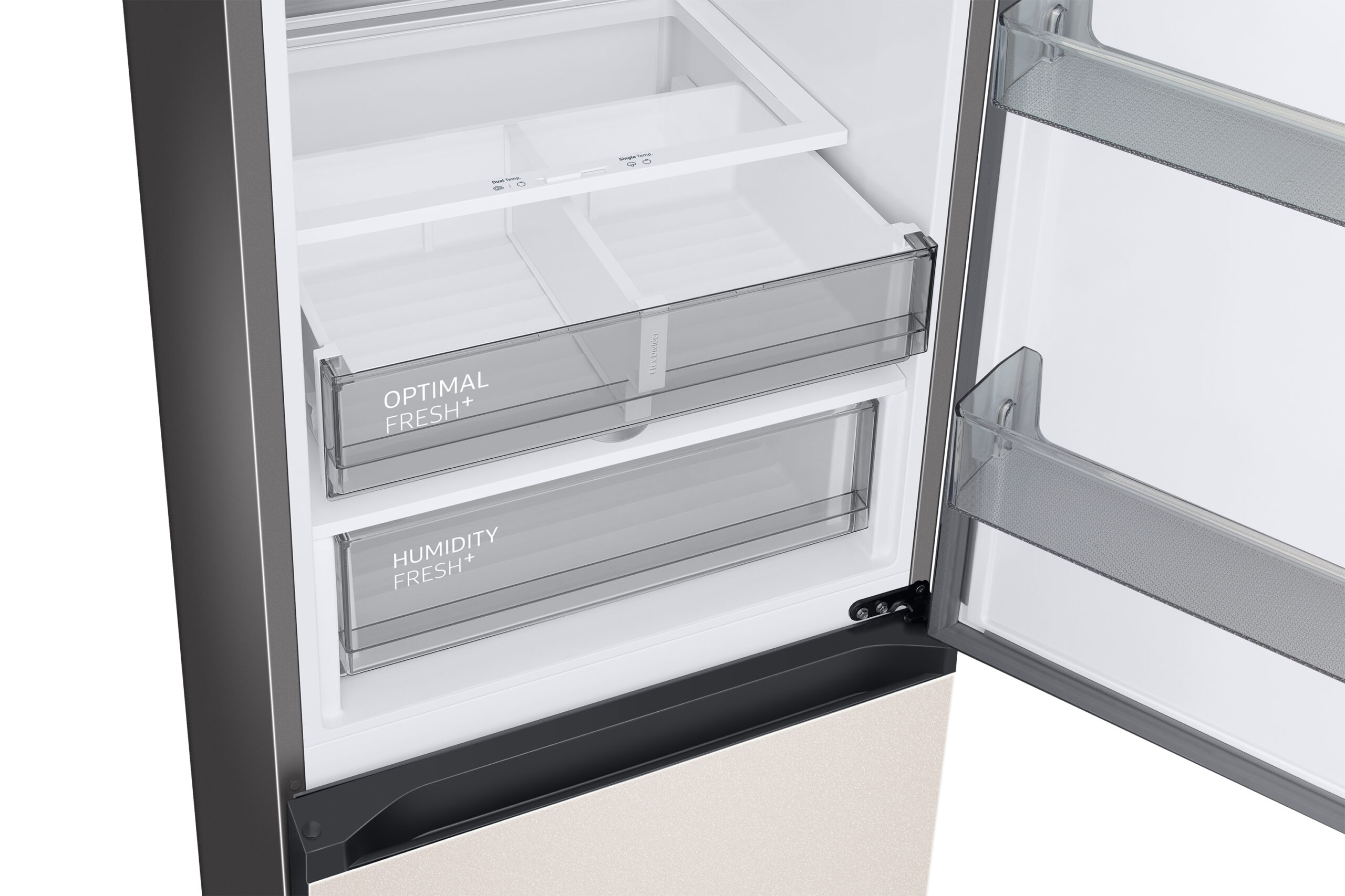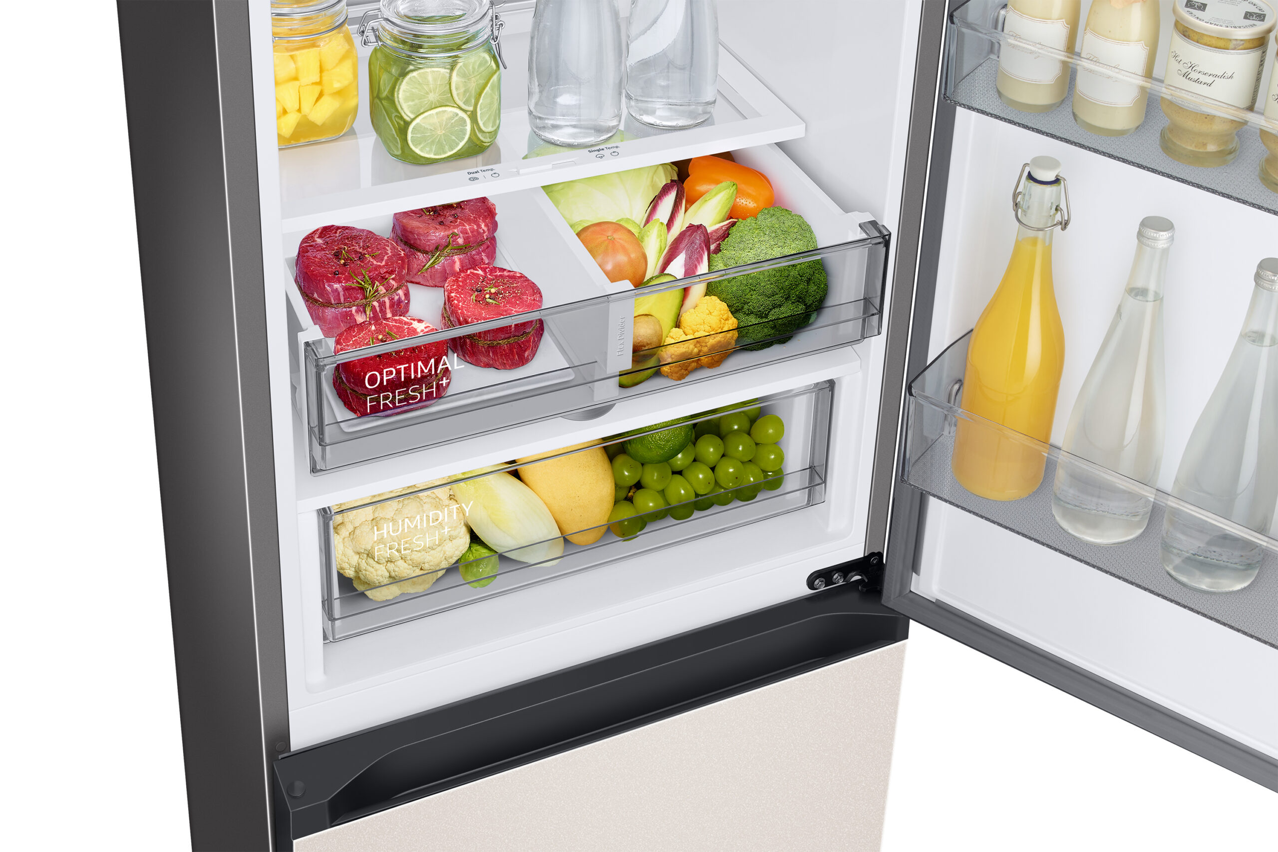 Bewaar je etenswaren op de juiste temperatuur die bij ze past. Voor de optimale versheid van je producten is het voor vlees en vis beter om ze te bewaren op een koudere temperatuur dan bij groente en fruit. Daarom beschikt deze koelvriescombinatie over een Optimal Fresh+ lade; een lade waarin je twee zones hebt om twee verschillende temperatuurstanden op in te stellen. De linkerkant kan je koeler instellen dan de rechterkant, wat deze zone perfect maakt voor vlees en vis omdat de smaak en malsheid beter behouden blijft. De rechterkant daarentegen is weer beter om groente en fruit vers te houden. Zo heb je flexibele opbergruimte die er ook voor zorgt dat je etenswaren langer vers blijven!