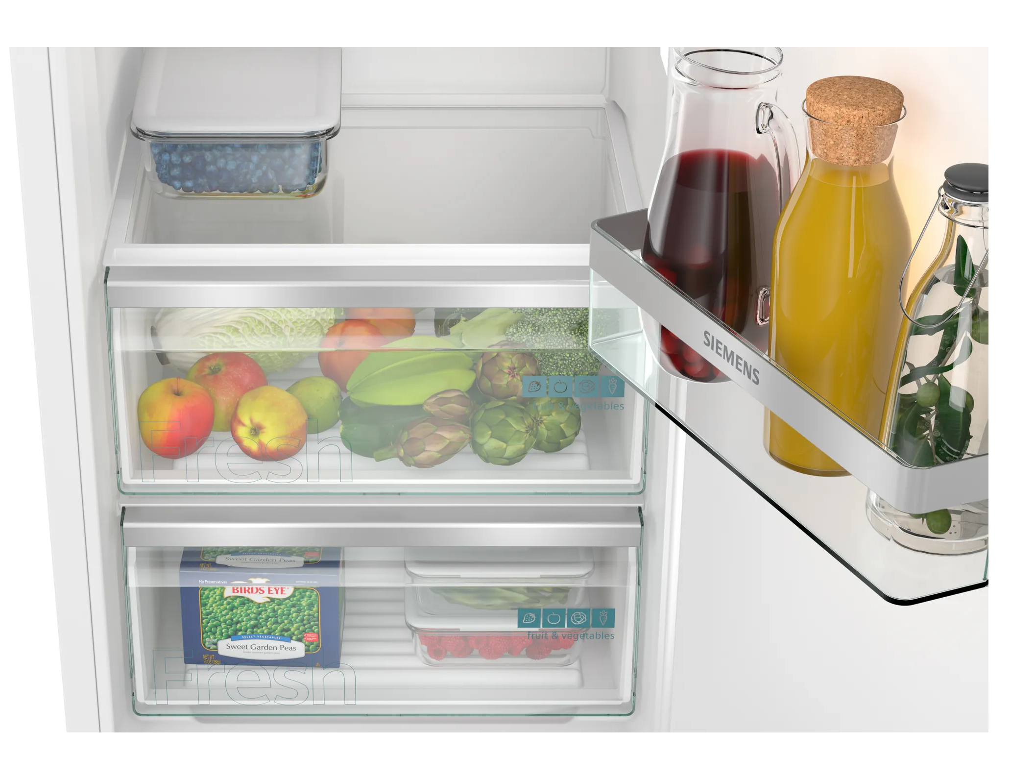 Verse ingrediënten mogen gezien worden.nZie jij je etenswaren ook graag in het juiste licht?De ingebouwde energiezuinige ledverlichting zorgt voor gelijkmatig licht in de hele koelkast, zodat je goed overzicht hebt van al je etenswaren en meteen ziet wanneer er iets aangevuld moet worden. Omdat de ledverlichting vooraan gemonteerd is, wordt deze niet geblokkeerd door de spullen in de koelkast. En als je een apparaat hebt met Home Connect, kun je de verlichting bedienen en de helderheid instellen met de Home Connect-app.nnBoodschappen koelen in een handomdraai.nWil je je last-minute boodschappen snel gekoeld hebben? Met superKoelen kan dat. Deze functie verlaagt met een druk op de knop de temperatuur in de koelkast en koelt snel je verse producten. Of je nu een voorraad inslaat voor een feestje of net terug bent van de markt, je producten zijn in een handomdraai perfect gekoeld. Ben je nog onderweg en heb je een gekoppelde smartphone, dan kun je via de Home Connect-app de functie instellen. Cool, hè?nnBewaar je flessen beter.nFlessen hebben hun eigen plek nodig en die vinden ze in ons flessenrek. Bewaar grote flessen, kleine flessen en blikjes allemaal in je koelkast zonder dat ze rammelen. De individuele houders voor je flessen houden ze niet alleen binnen handbereik, maar ook veilig en compact op hun plaats.nnBreukbestendig en makkelijk schoon te houden: safetyGlass-plateausnAlle glazen plateaus zijn gemaakt van extra sterk, gemakkelijk te reinigen veiligheidsglas. Als er iets omvalt, blijft de knoeiboel beperkt tot het plateau en loopt het niet over naar de rest van de koelkast.nnHet vriesvak aanpassen.nMet varioZone kun je de lades en de plateaus tussen de laden weghalen. Dankzij de flexibele indeling van je vriezer lijkt het wel een persoonlijke opbergkast vol bevroren producten.