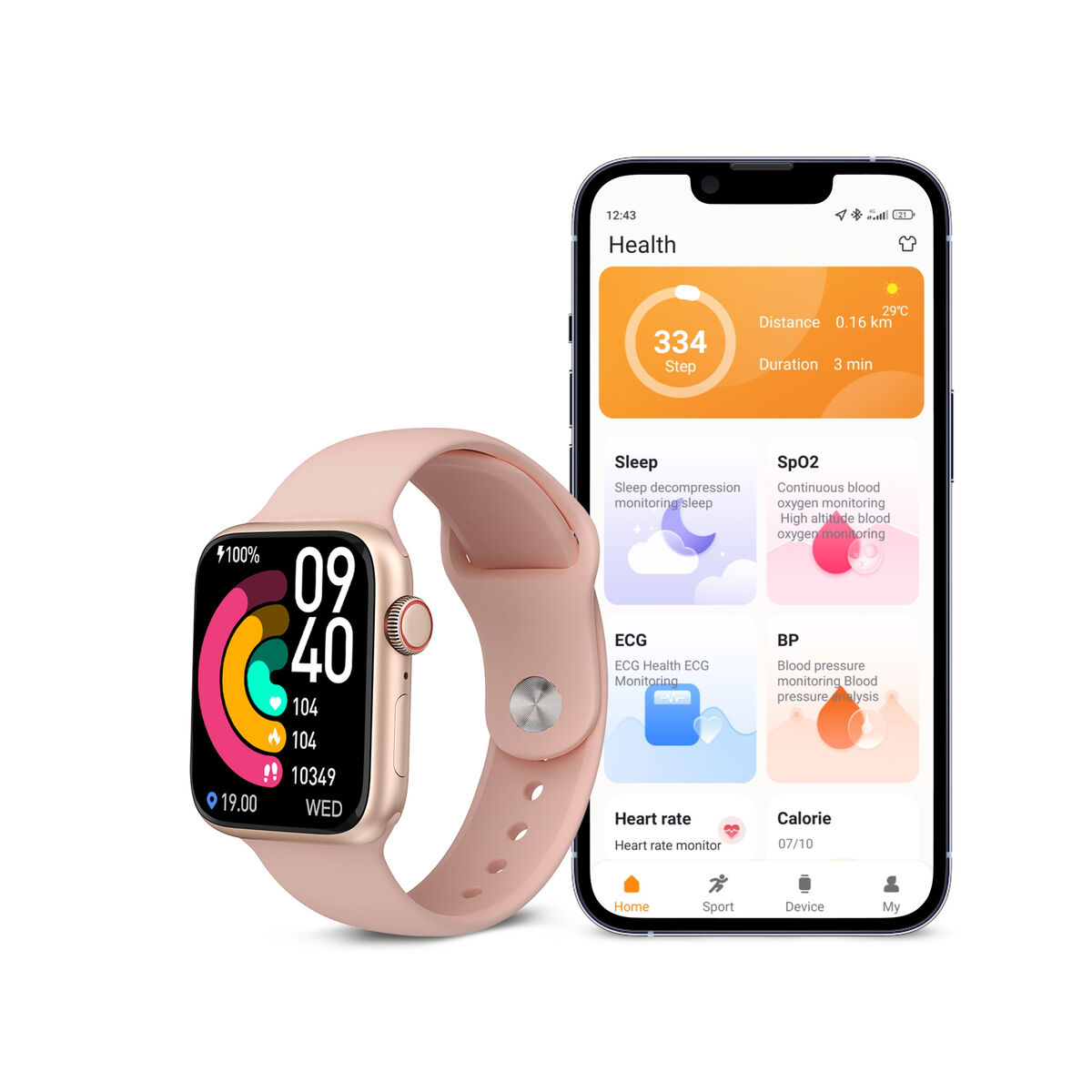 Deze compacte smartwatch heeft een moderne, vierkante display van 1,74 inch met veel stijl en intelligentie. De gestroomlijnde roze tint en het minimale ontwerp stralen een eigentijdse flair uit, maar onder die modieuze buitenkant schuilt een krachtige wellness metgezel. Houd eenvoudig fitnessgegevens bij, zoals hartslag, zuurstofgehalte en slaapcycli, en synchroniseer de gegevens vervolgens met je telefoon via Bluetooth. De antidiefstalfunctie helpt bij het opsporen van een zoekgeraakt horloge, terwijl de IP68 waterdichtheid beschermt tegen spatten en morsen. Met magnetisch opladen en een lange batterijlevensduur is dit wondertje gemaakt om je actieve levensstijl bij te houden. Verbeter je accessoiregame en zelfzorgroutine in één stijlvol pakket.