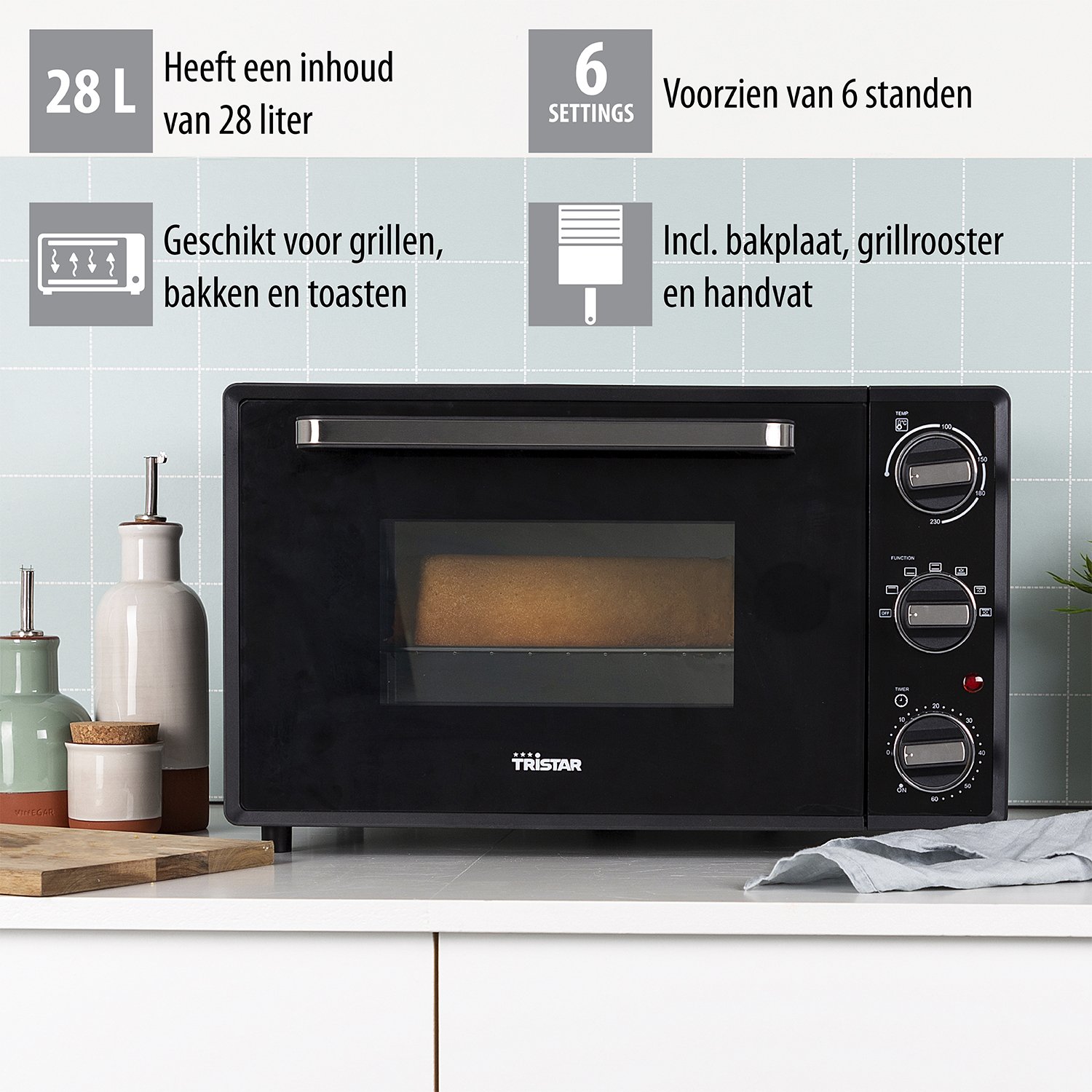 Bereid eenvoudig de heerlijkste gerechten als witlof uit de oven, ovengerechten, taarten en broodjes. De praktische Tristar OV-3625 convectieoven is geschikt voor grillen, bakken en toasten. De heteluchtoven is uitgevoerd met 60 min. timer, binnenverlichting, bakplaat, en grillrooster met bijpassend handvat.