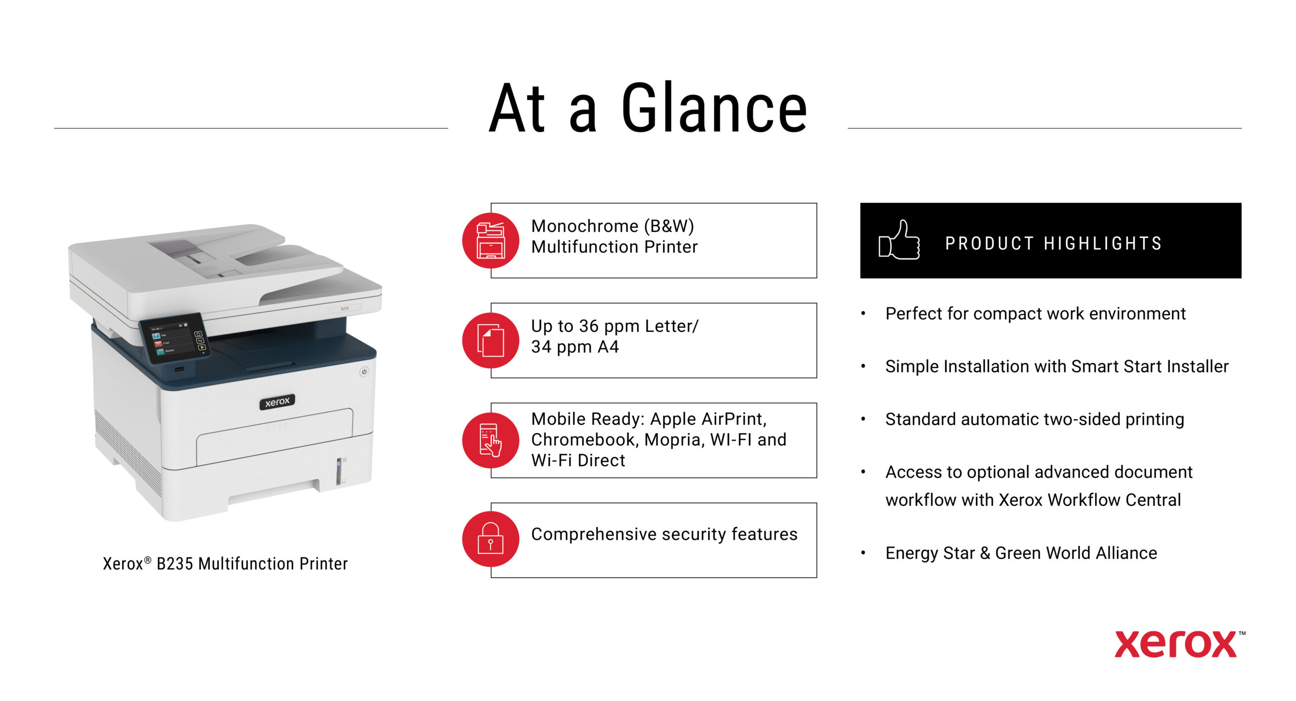 Xerox B235 A4 34 ppm draadloze dubbelzijdige printer PS3 PCL5e/6 ADF 2 laden totaal 251 vel